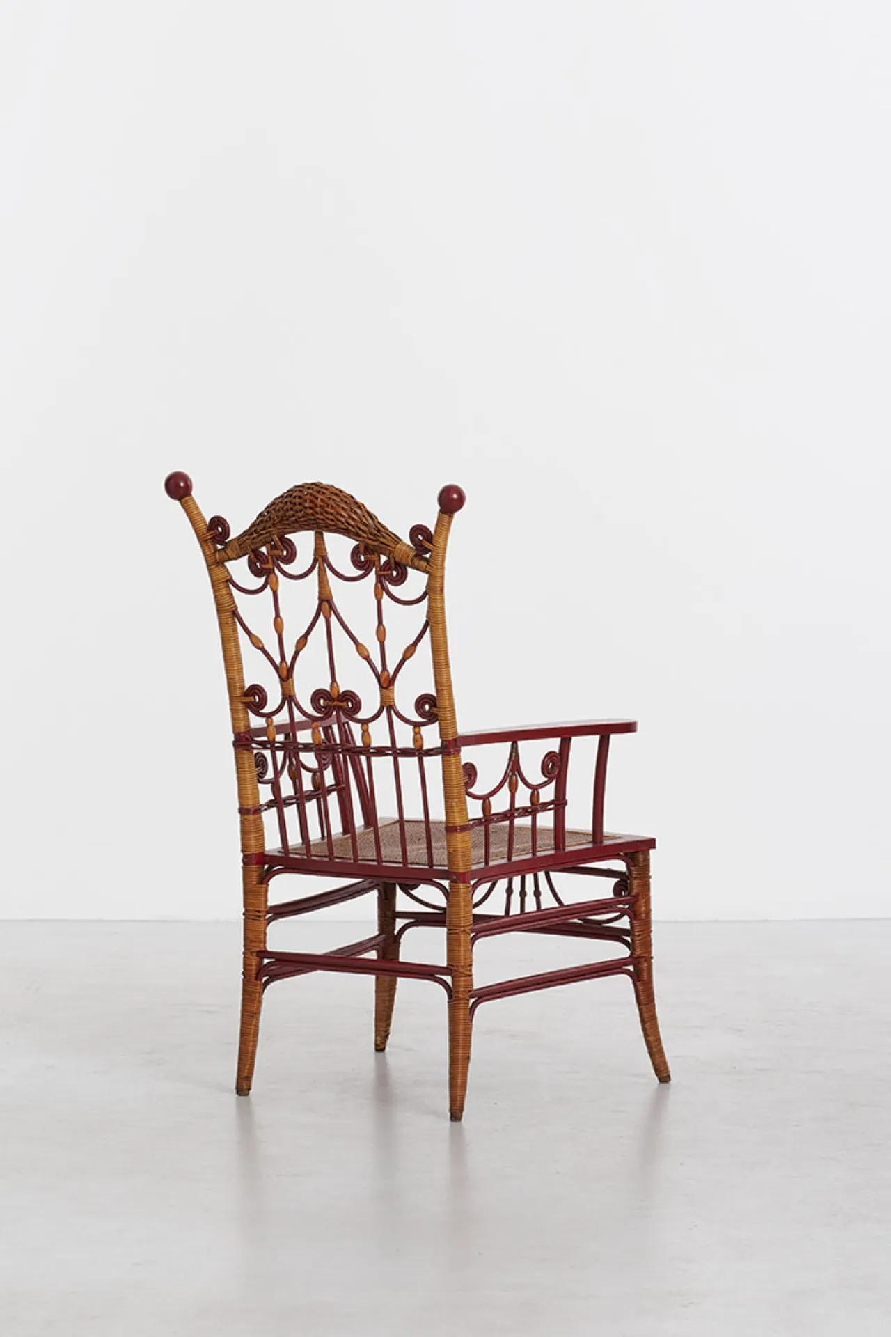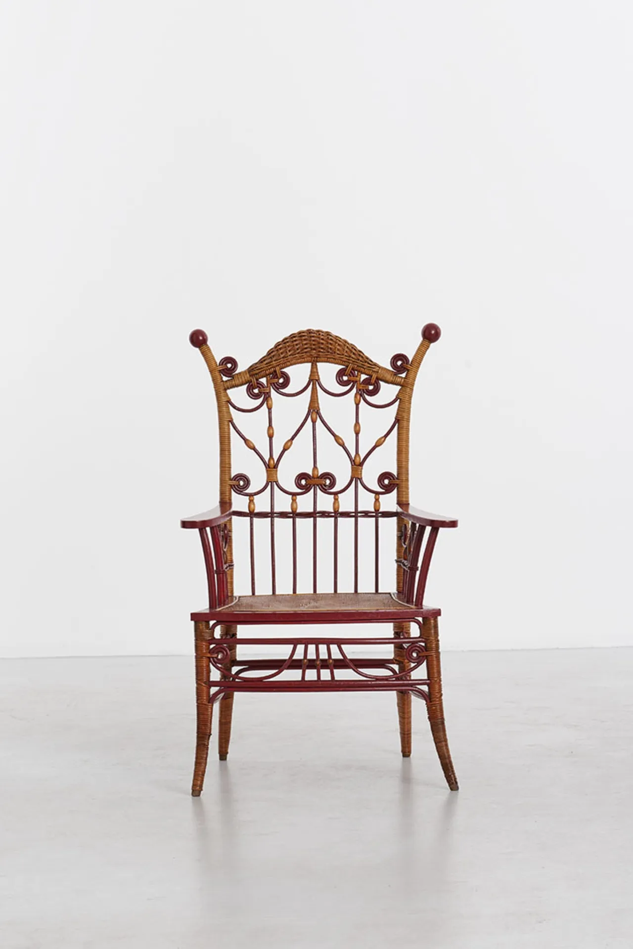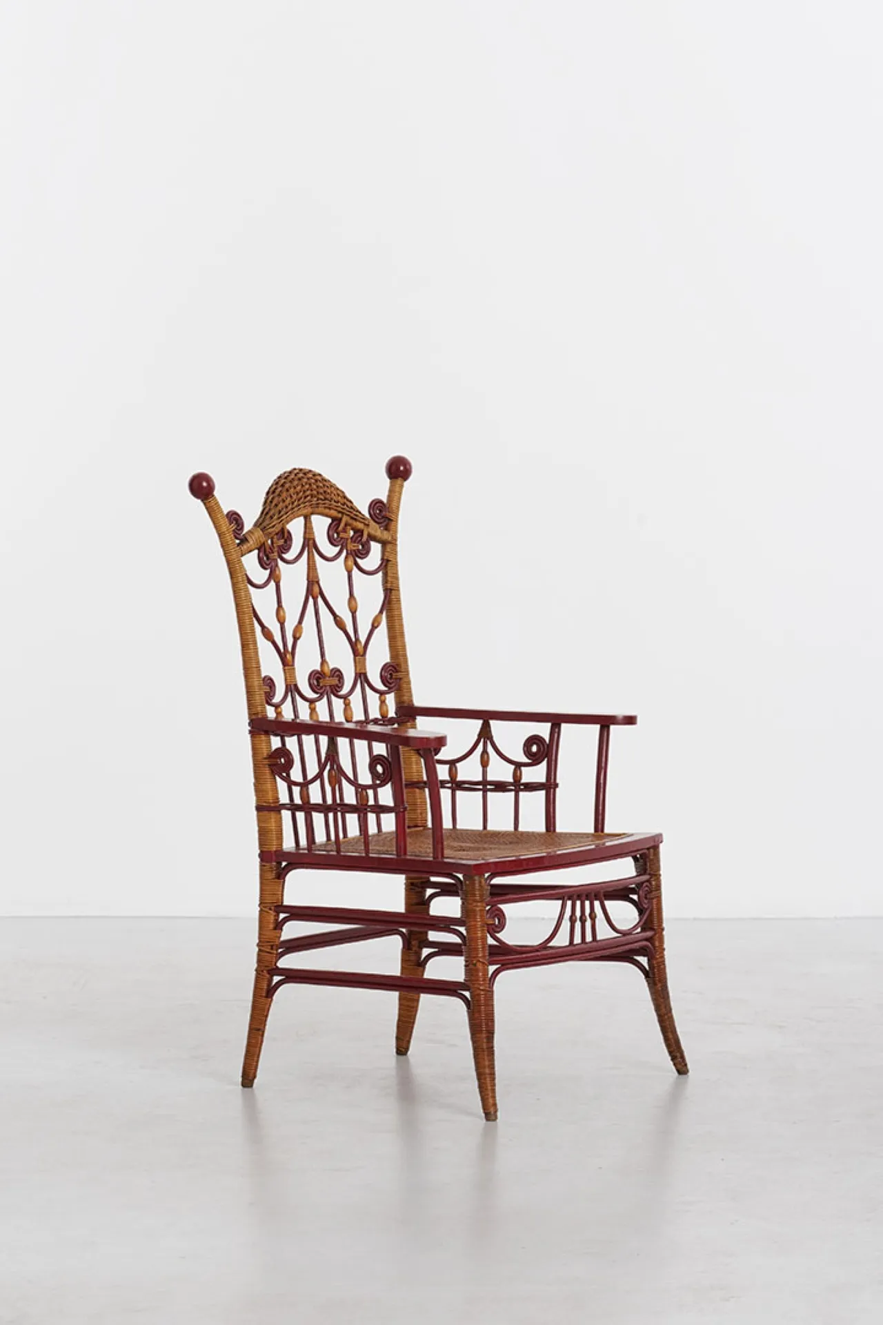 Manufactured by Italo Crenna Company in the late 19th century, this armchair is part of set that features two elegant wicker armchairs and a low painted glass coffee table. With their distinctive wicker detailing, the pieces showcase exceptional craftsmanship and timeless design.