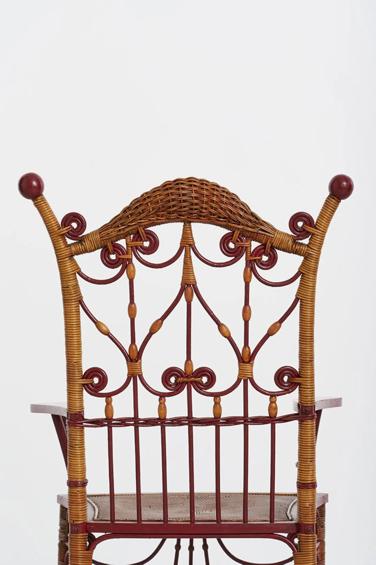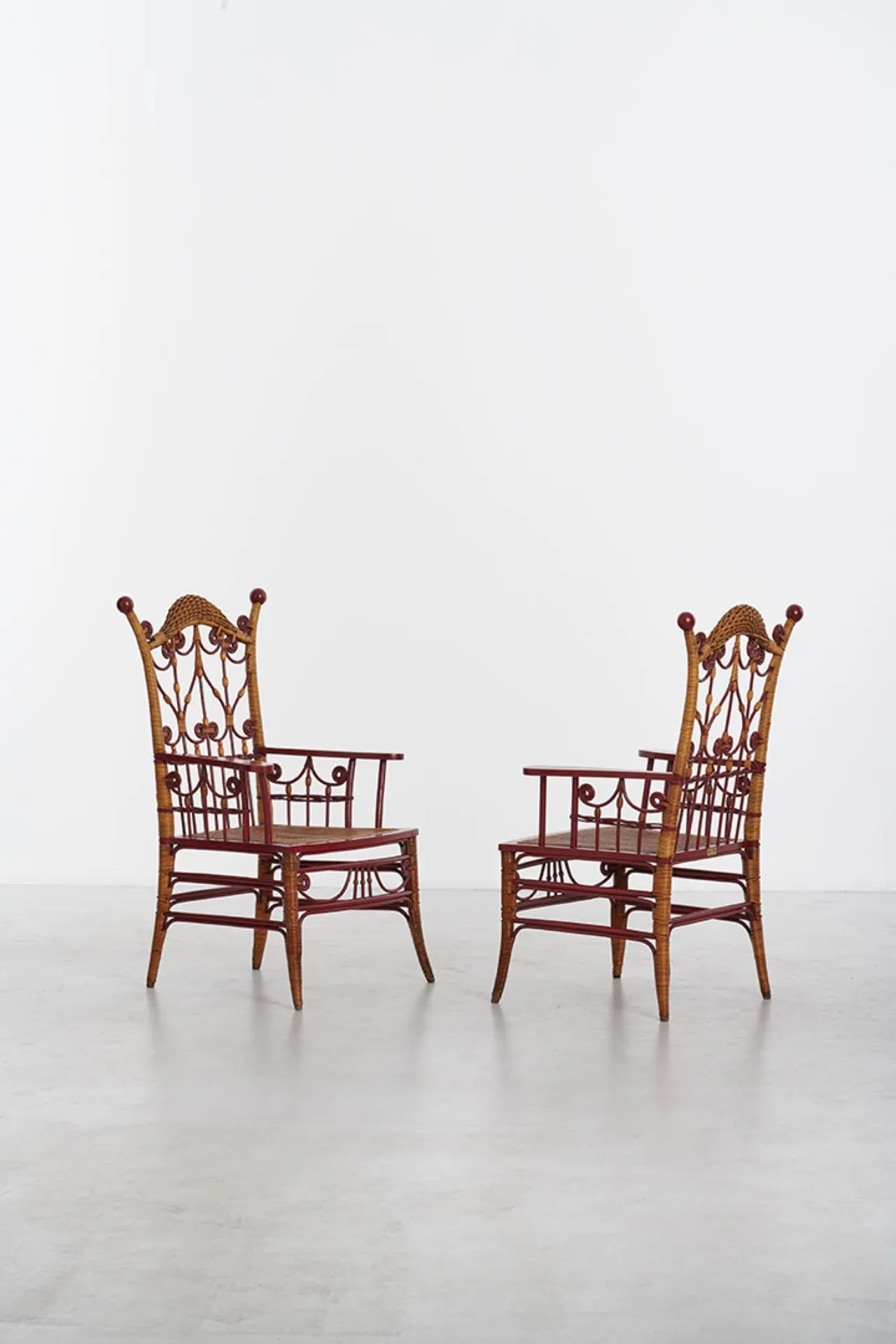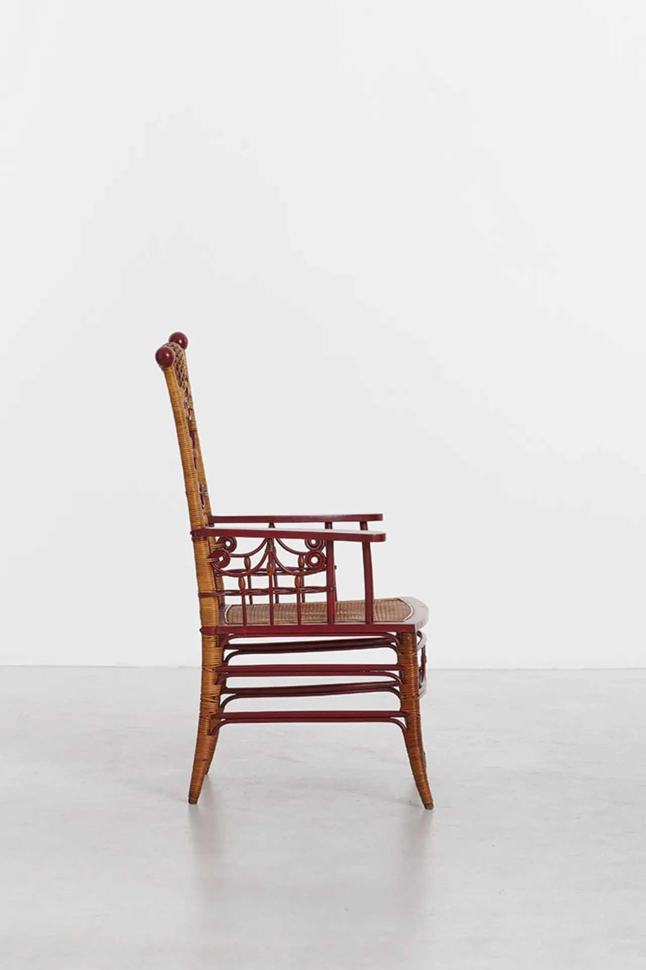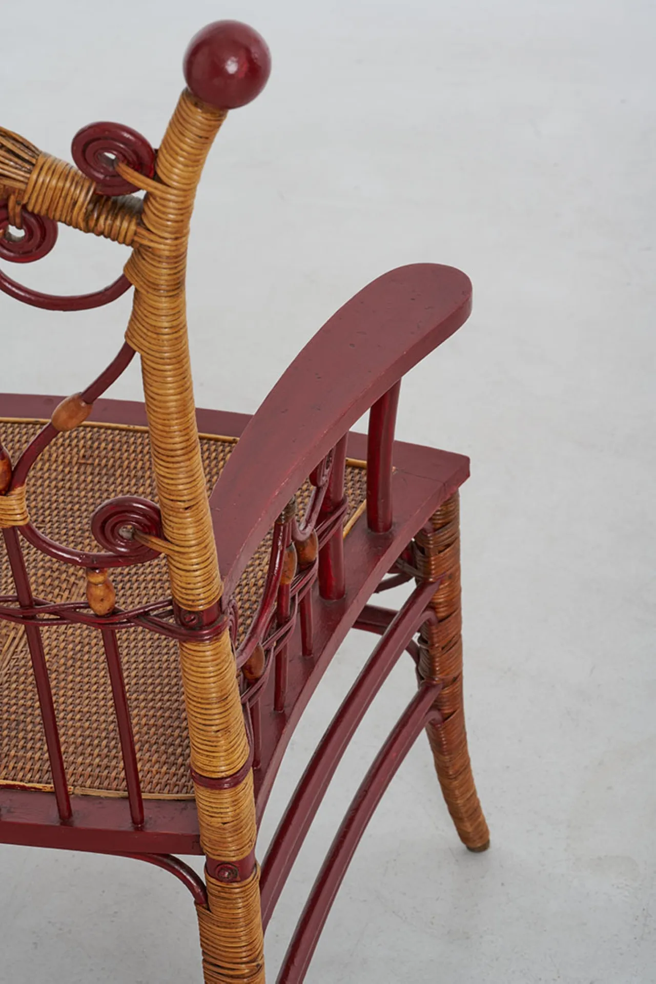 Manufactured by Italo Crenna Company in the late 19th century, this armchair is part of set that features two elegant wicker armchairs and a low painted glass coffee table. With their distinctive wicker detailing, the pieces showcase exceptional craftsmanship and timeless design.