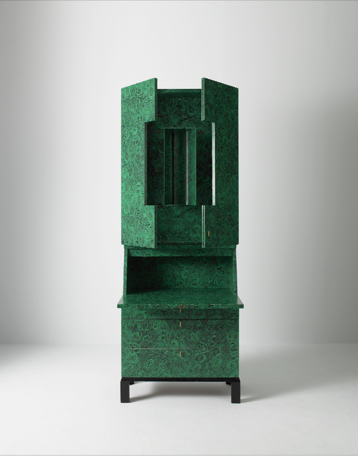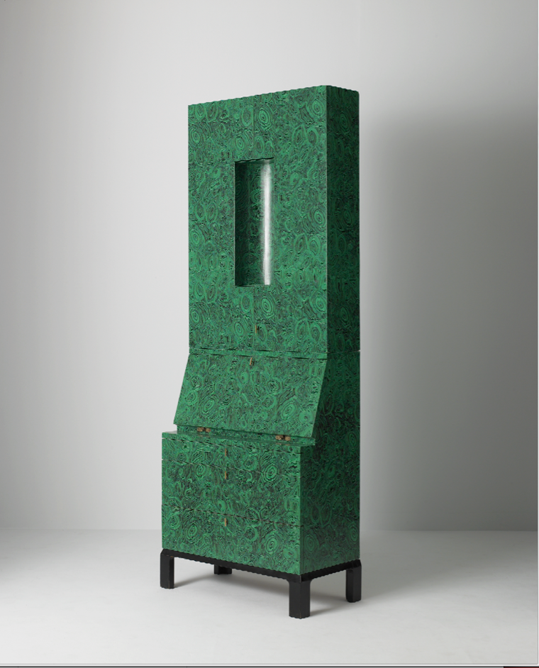 Green lacquered wood, black fake malachite lithographic transfer, metal, brass, glass, lighting device