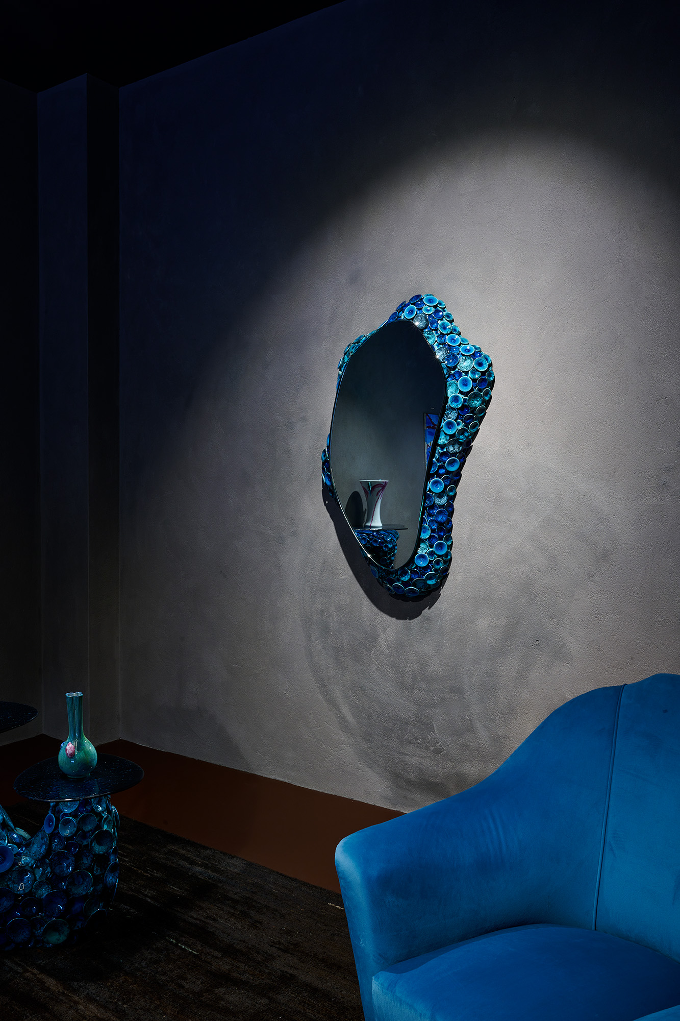 Acquario furniture collection draws inspiration from imagined corals and aquatic plants. The mottled coloring of indigo blue and turquoise green ceramic discs is created through chemical reactions during firing to mimic the texture of aquatic flora.