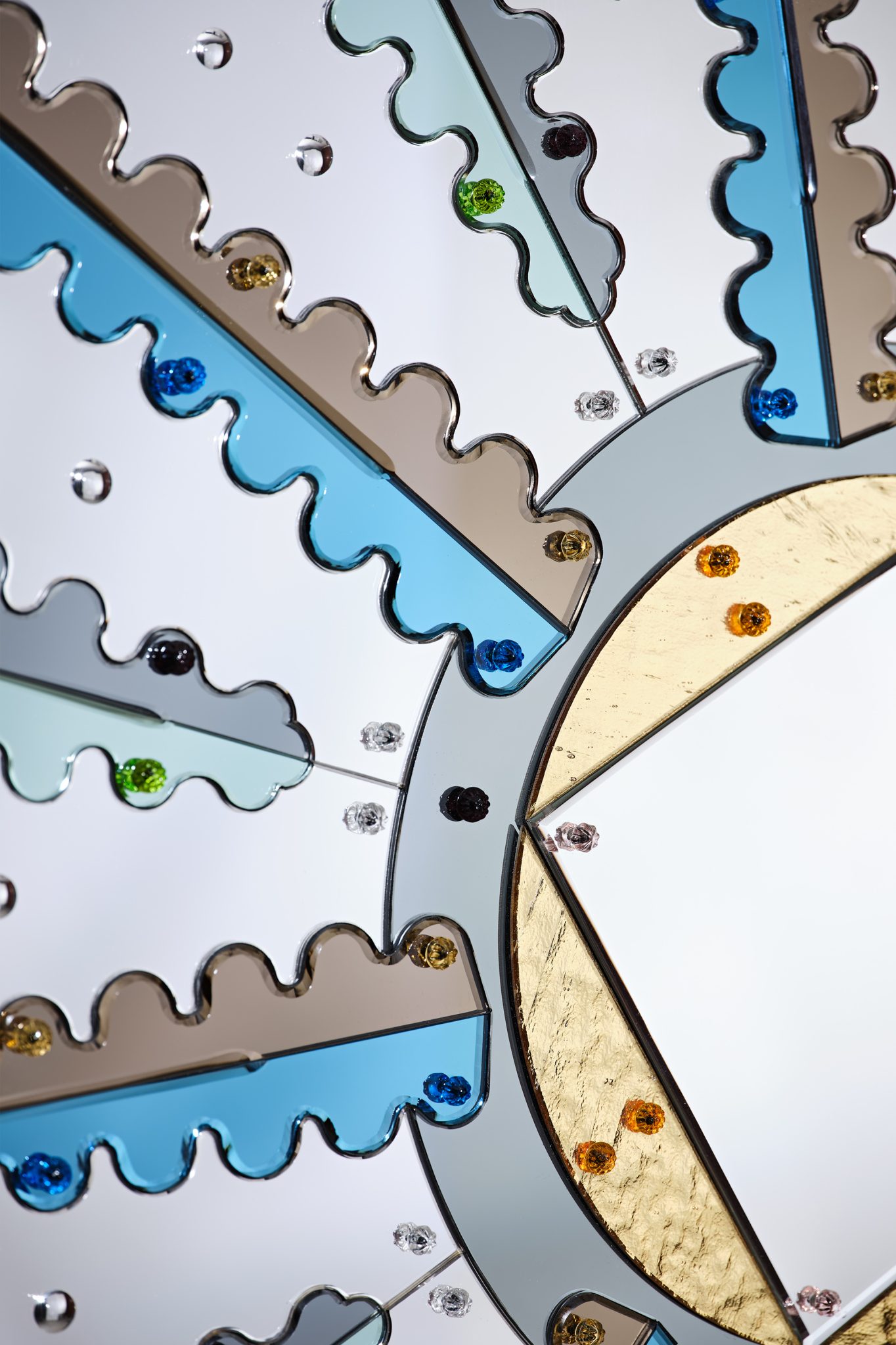 Part of the Aperitivo collection and crafted in collaboration with Venetian mirror specialists Barbini, Olive mirror continues Bethan fascination with "fake food". Drawn to handmade swirls, curls, and optical cuts, she blurs the line between natural patterns and stylized food imagery. Modern cutting techniques combine with traditional hand-formed details, evoking stylized fruit droplets or seeds.