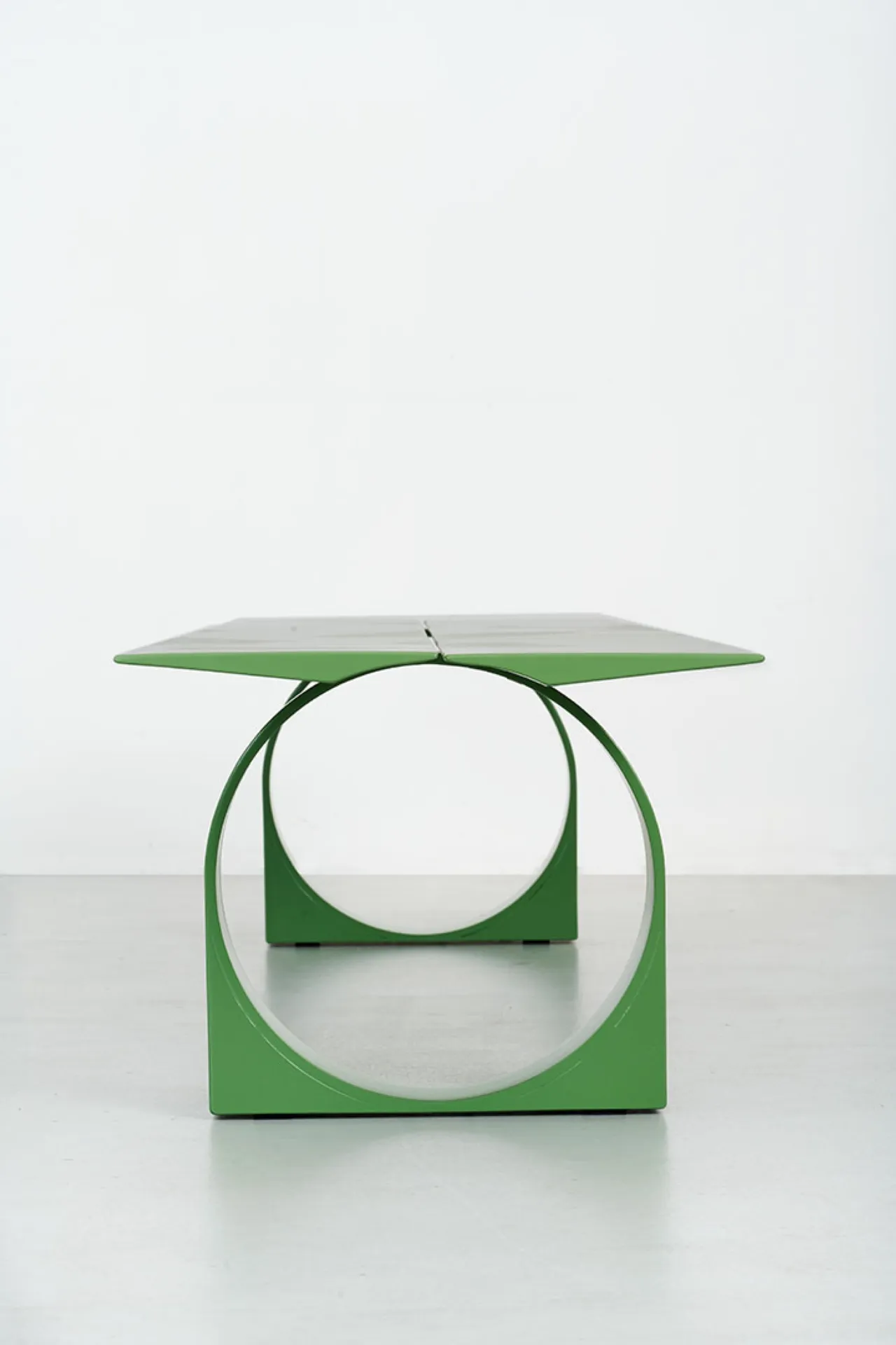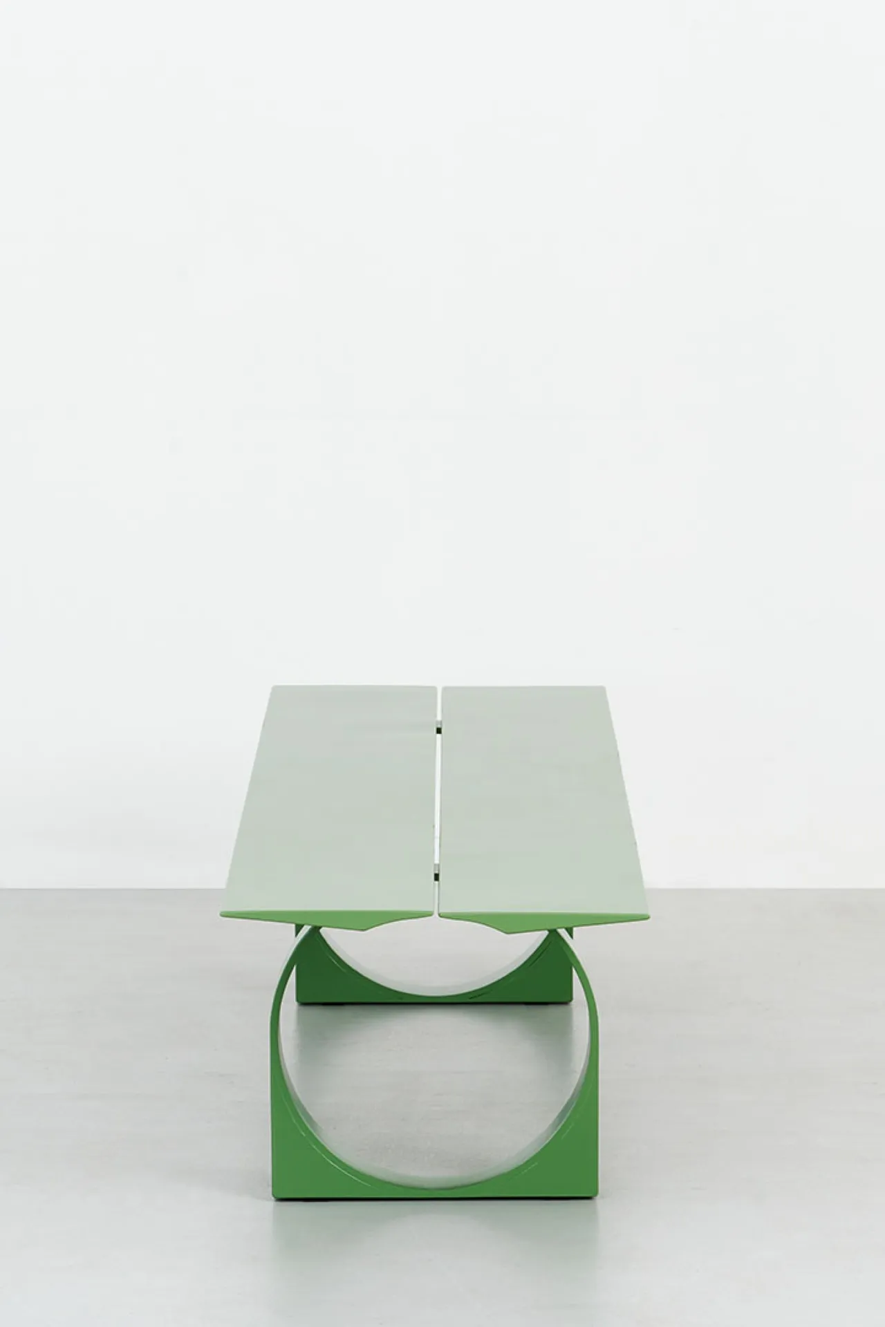 The search for the minimum, for the essential gesture, passes through the study, experimentation and understanding of the material itself. The multiple bending of the sheet metal gives the steel sheet a double rib. The result of this gesture becomes the spine of the table as well as the bench, characterizing the Libra project in its essence. The profiled top, as thin as a wing, levitates in balance on the hoops firmly on the ground, as if to defy gravity. The top and the two supports on the ground transcribe in their sculptural result a series of calendering, bending and finally welding of the metal sheet, always kept to a minimum.