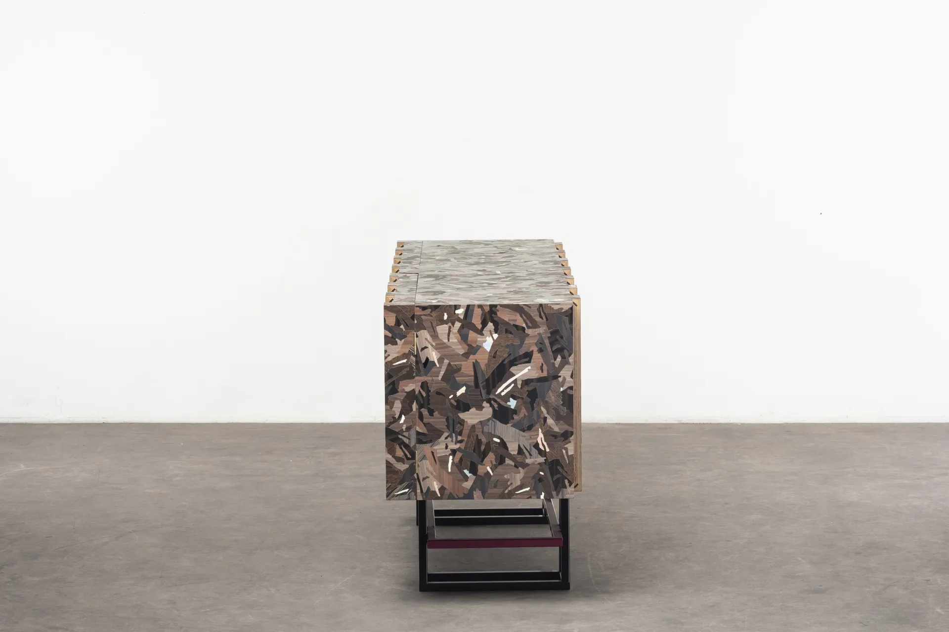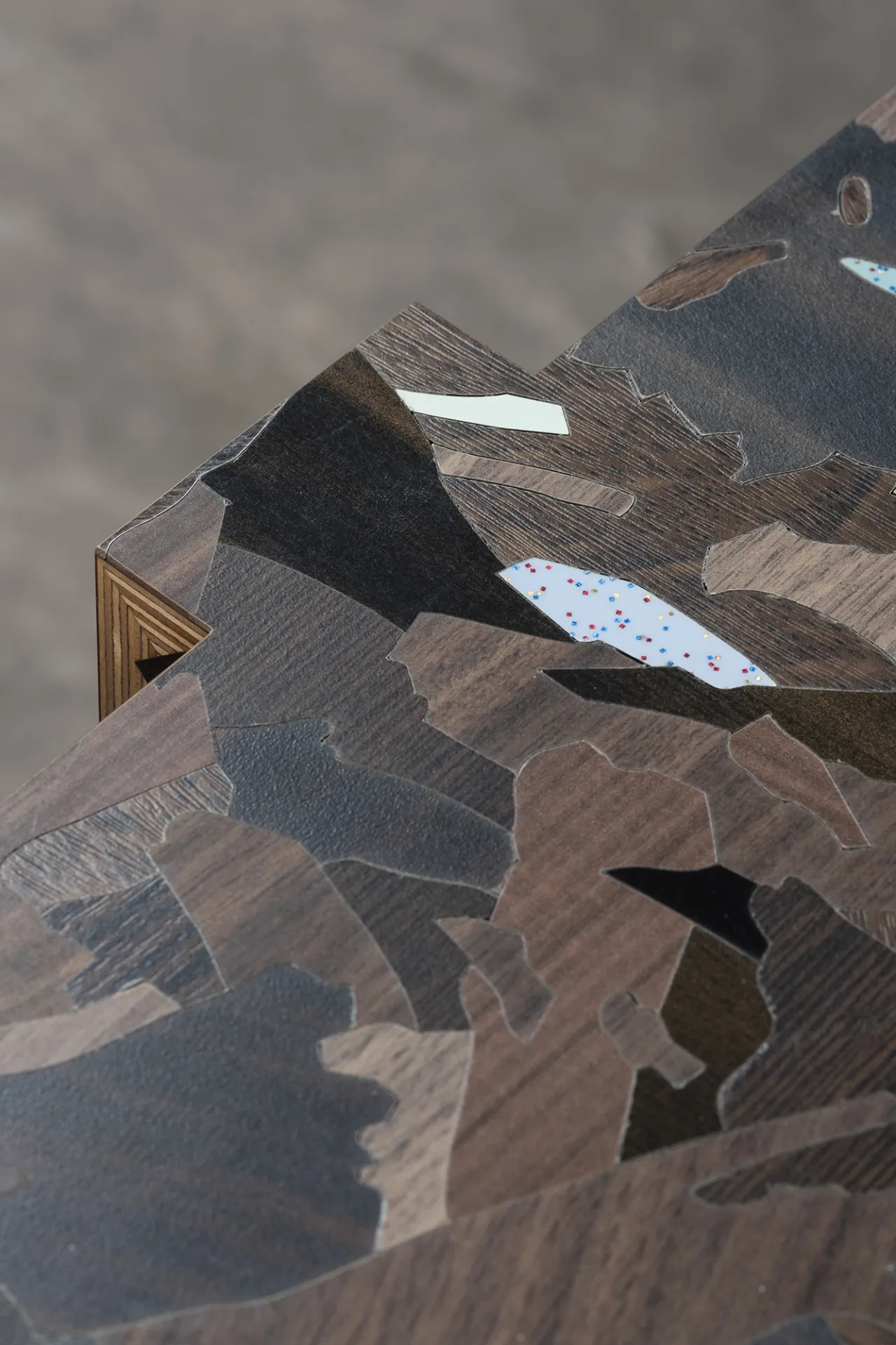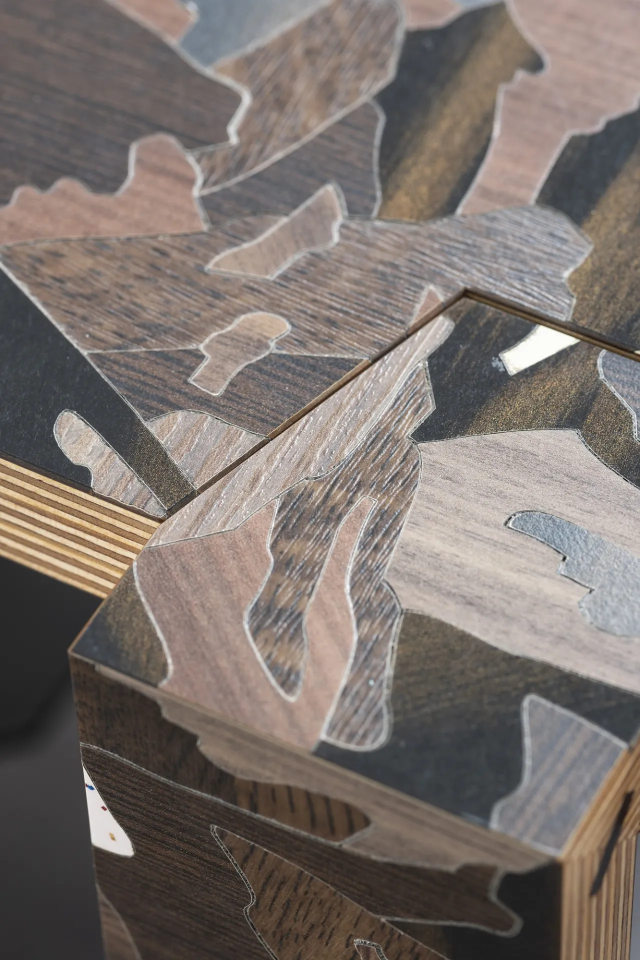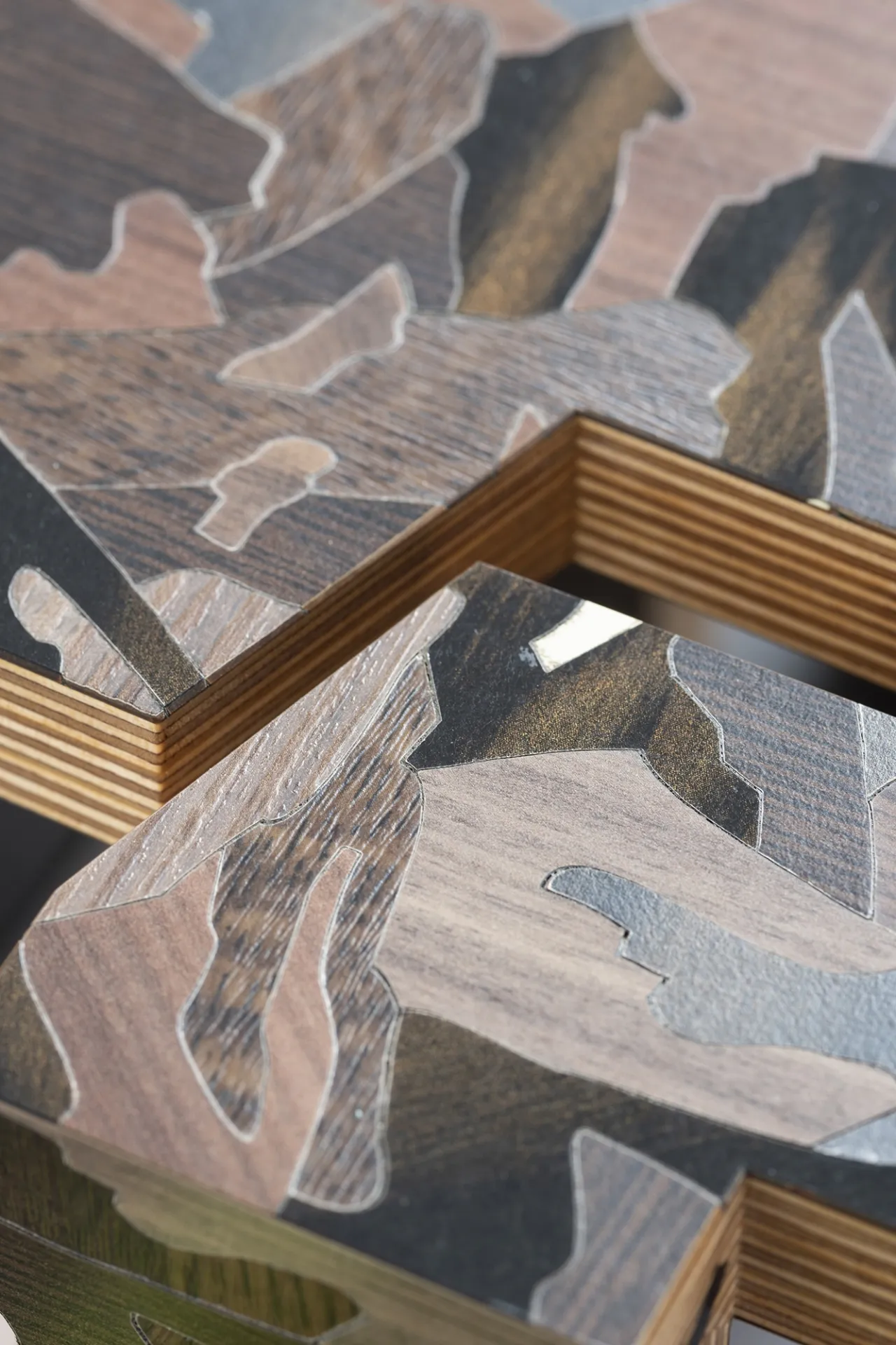 Particle is a furniture series designed during Bethan Laura Wood’s residency at the Design Museum, inspired by its location at Butlers Wharf, once a banana warehouse. Reflecting on its history, Bethan created a modular system based on crates and packaging. The design uses faux wood laminates from Abet Laminati, transforming mundane materials into striking patterns inspired by particleboard.
