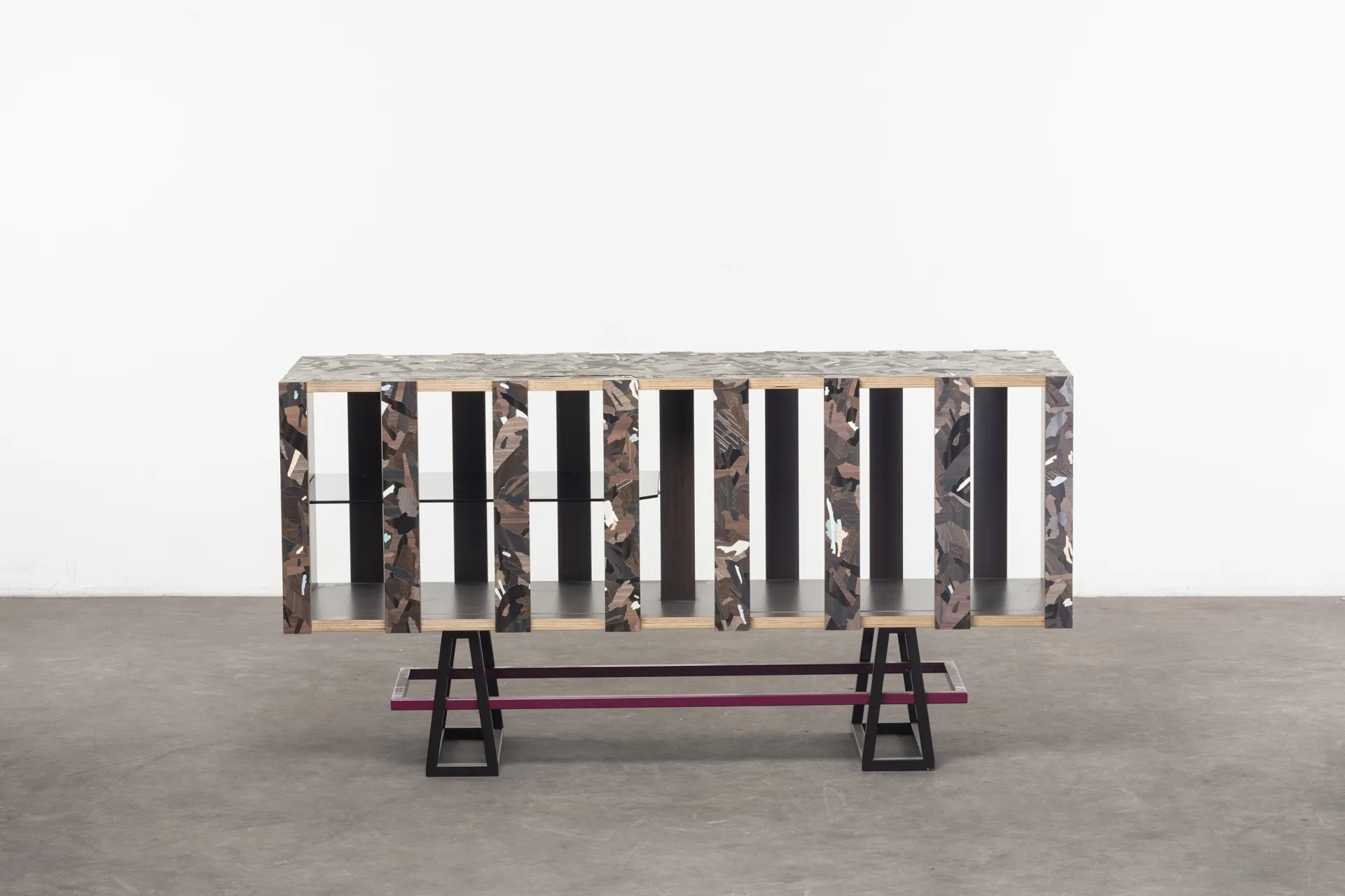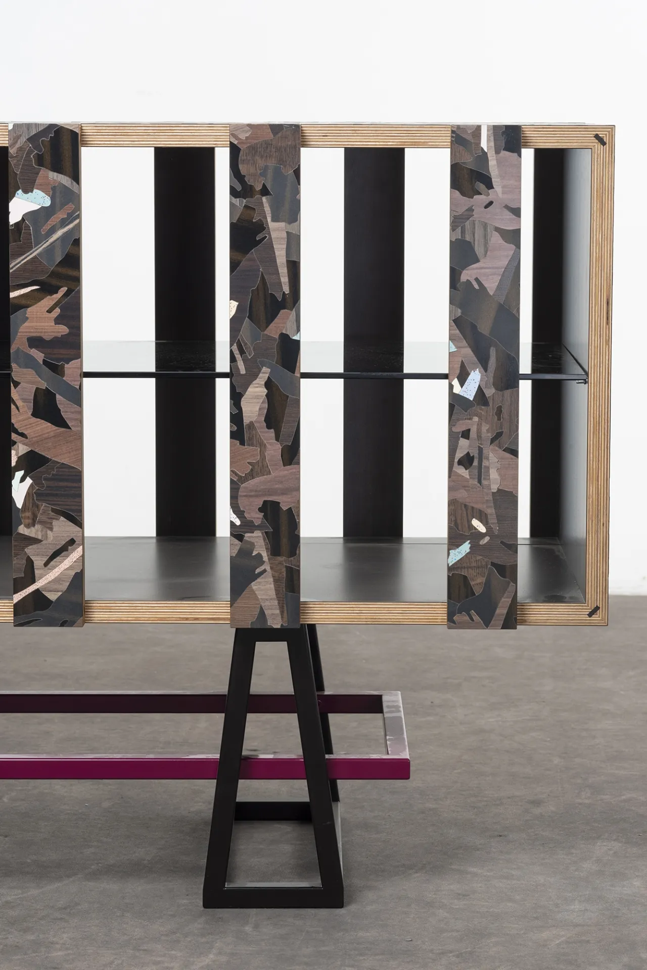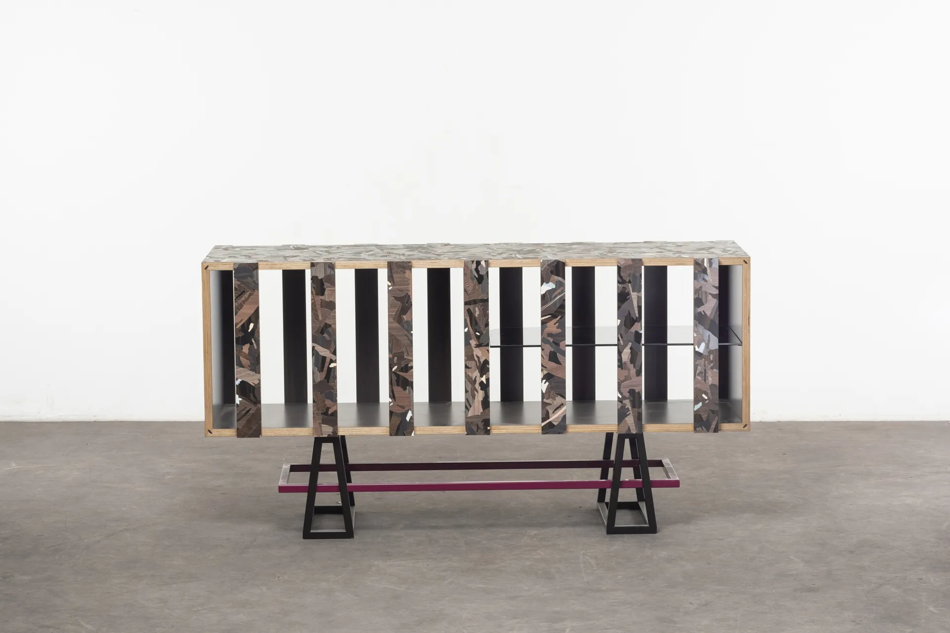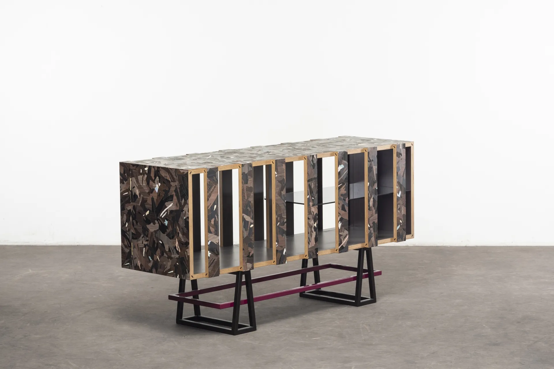 Particle is a furniture series designed during Bethan Laura Wood’s residency at the Design Museum, inspired by its location at Butlers Wharf, once a banana warehouse. Reflecting on its history, Bethan created a modular system based on crates and packaging. The design uses faux wood laminates from Abet Laminati, transforming mundane materials into striking patterns inspired by particleboard.