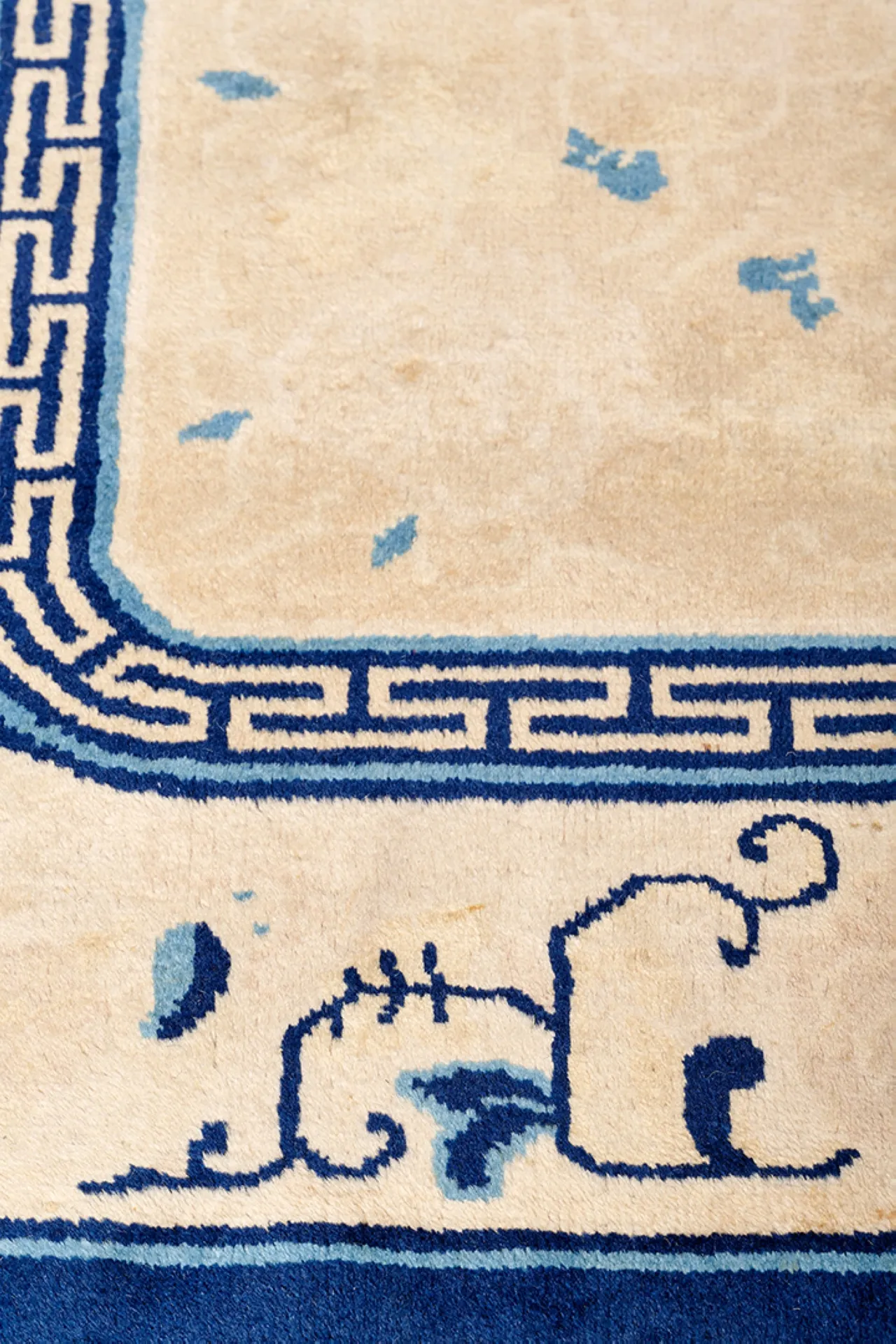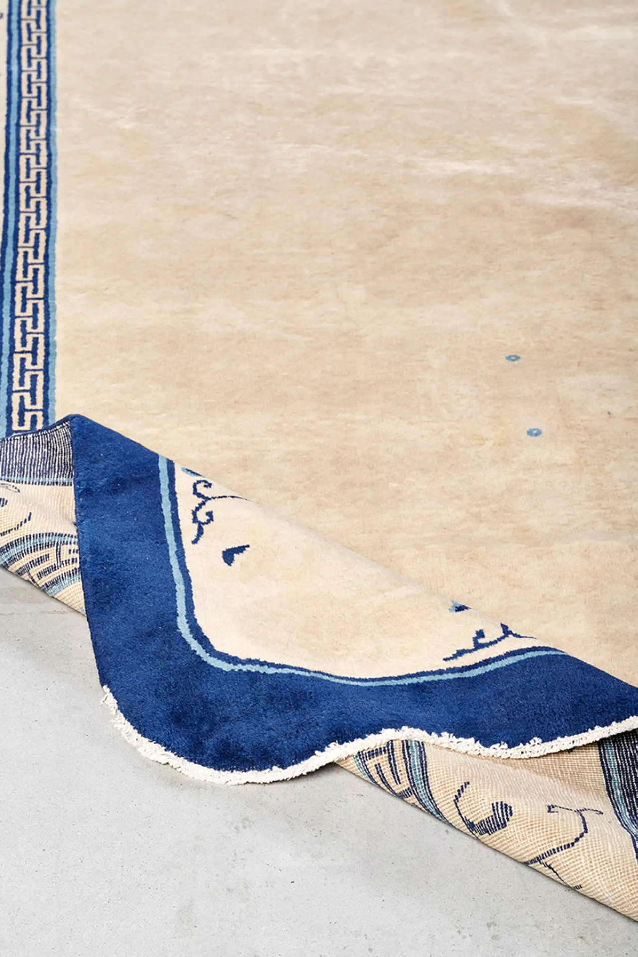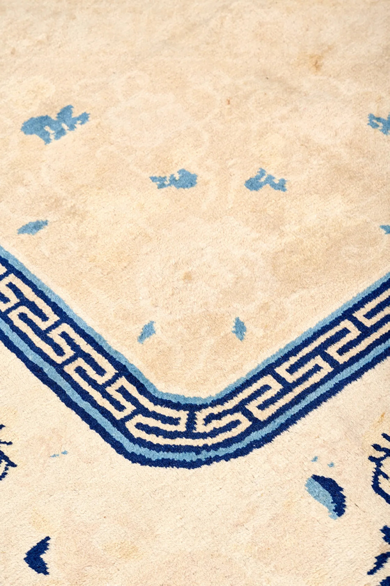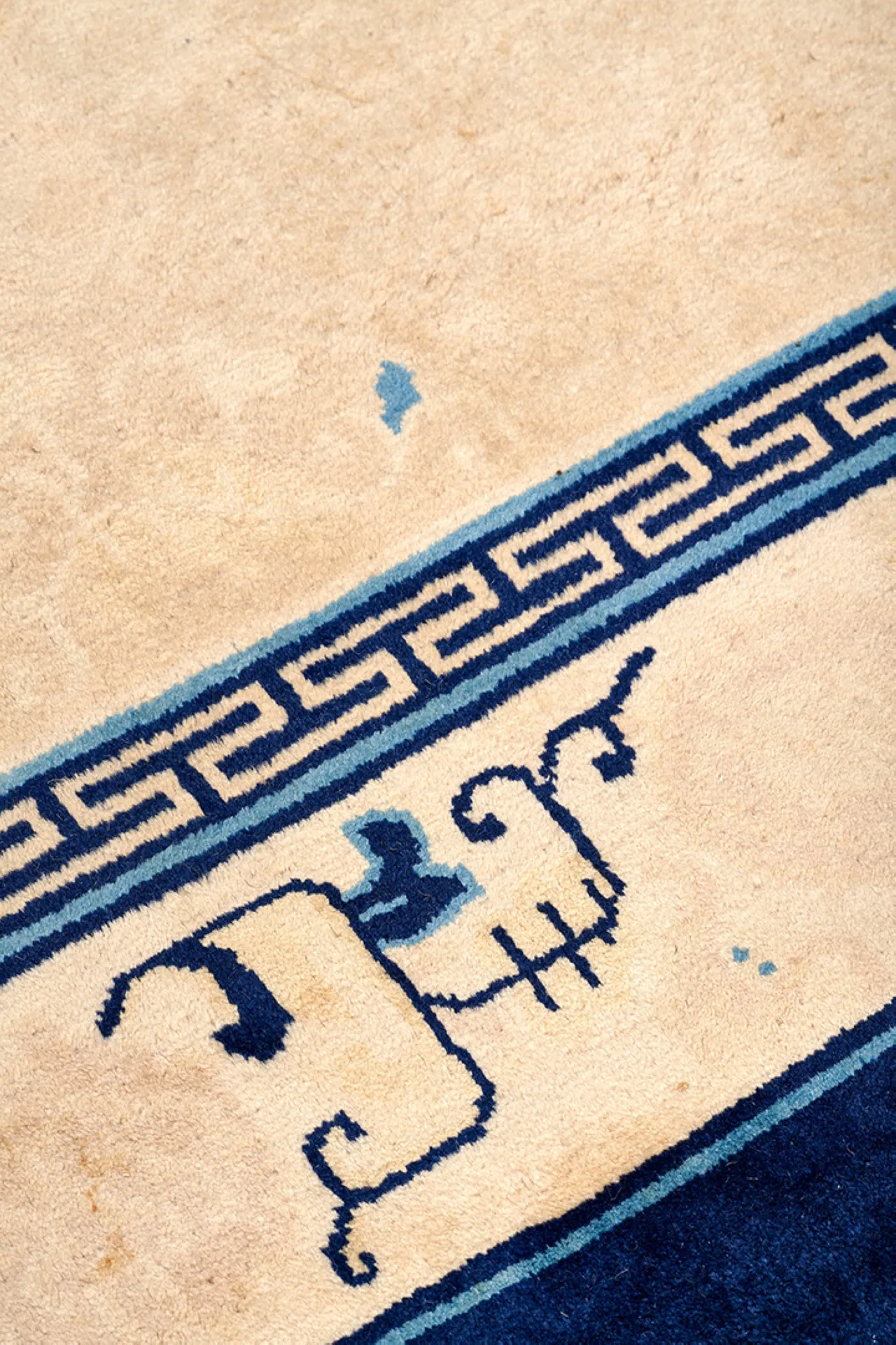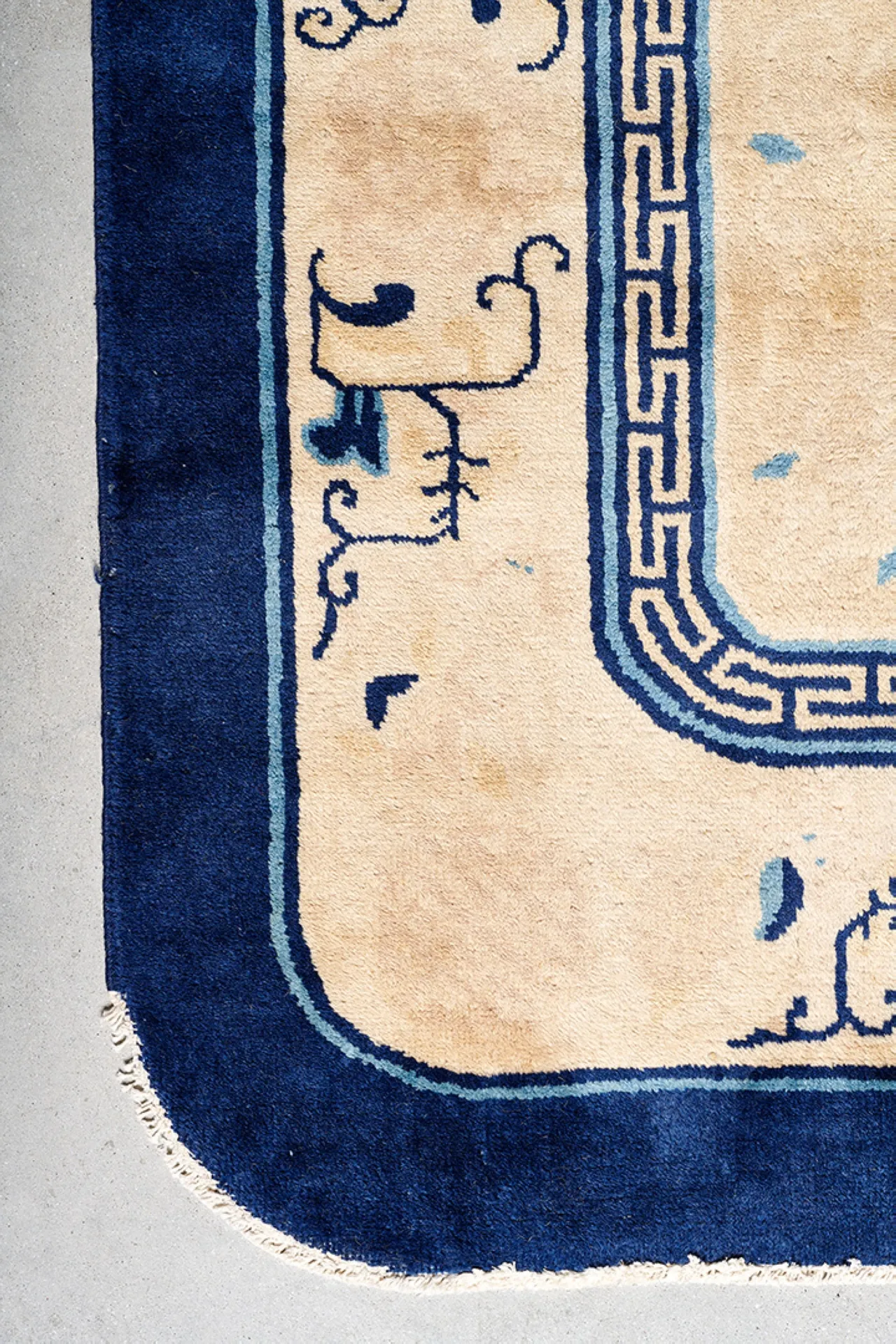 Crafted in China in the 1920s, this Peking carpet showcase the rich heritage of Oriental craftmanship. With its distinctive color palette, hand woven technique and organic decorations, this carpet stands as a timeless statement piece, bringing elegance to any environment.