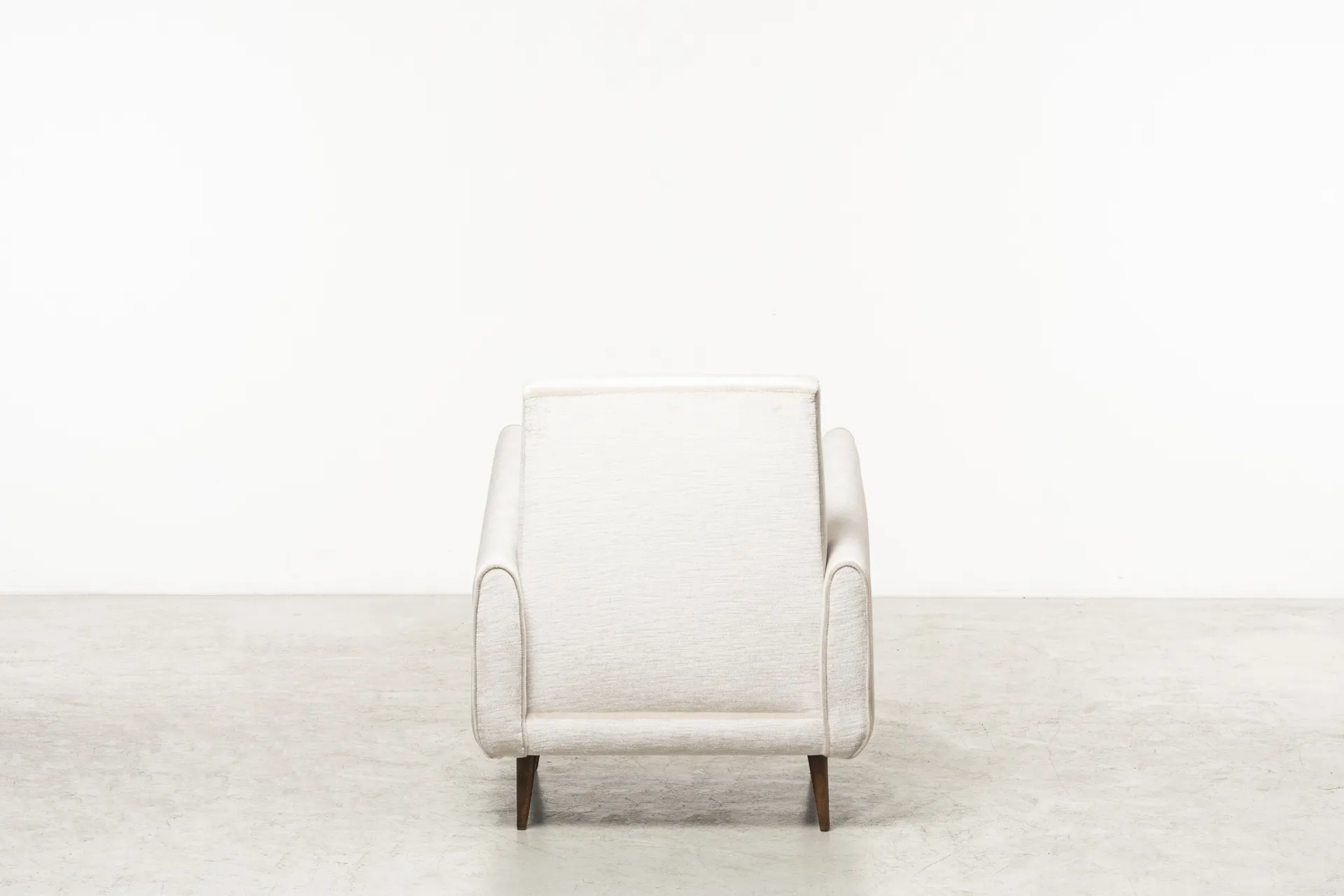 Manufactured in 1961 by Jorge Zalszupin company, L’Atelier, the mod. 801 armchair exemplifies the designer’s innovative approach to modern design. The striking contrast between the refined, sophisticated fabric and the rich Jacaranda wood structure elevates this piece to a timeless icon. These elements highlight the minimalistic elegance of Brazilian design, further emphasize by its simple yet captivating lines and armrests.