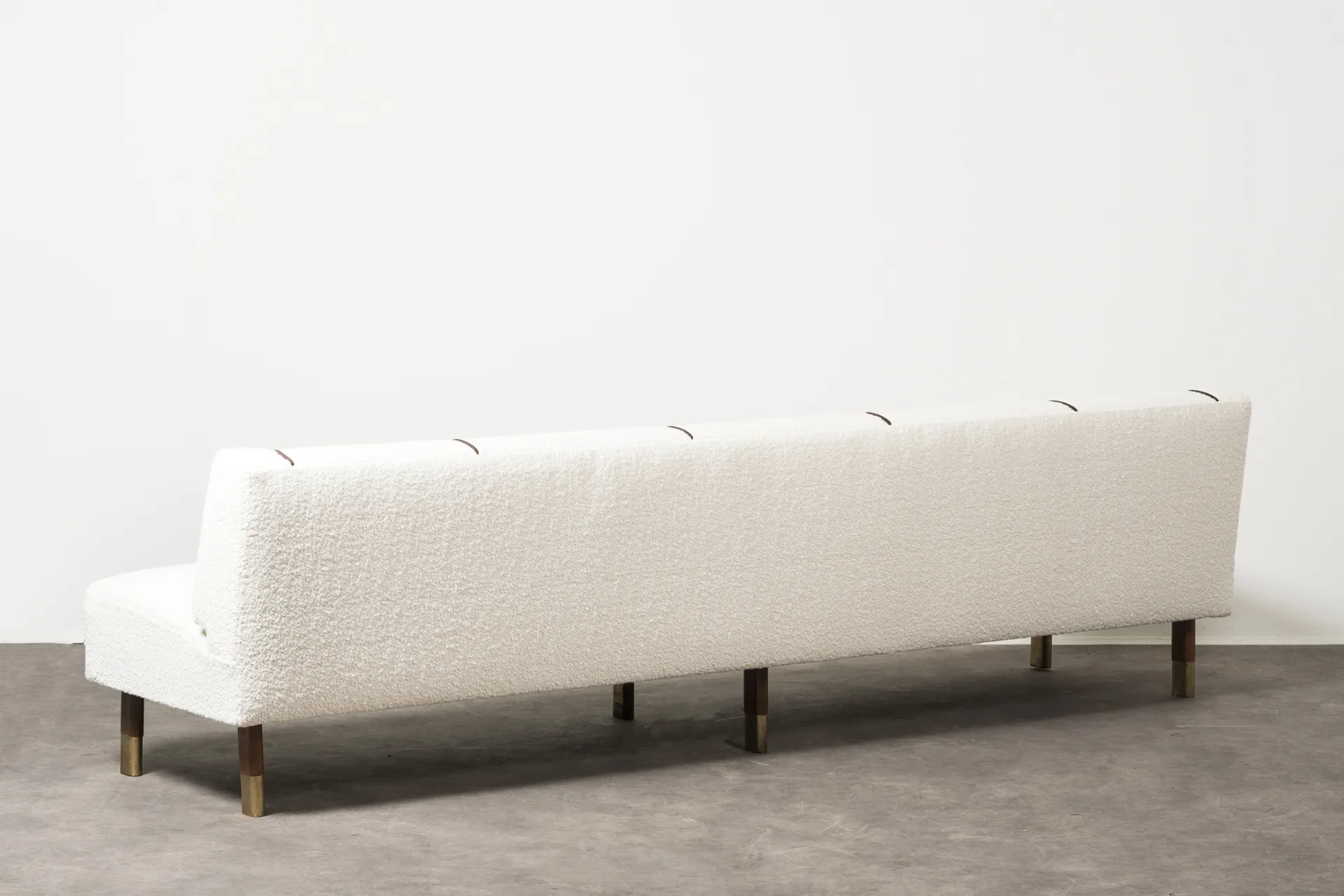 Designed to embody both modernism and functionalism, this rare sofa from around 1935 stands as a true masterpiece of Alvar Aalto's production. Featured in the design for The Social Insurance Institution of Finland (KELA) project between 1948 and 1956, this piece evokes Aalto's cherished concept of Gesamtkunstwerk (a complete work of art), emphasizing the integration between the surrounding environments and the interior spaces his designs inhabit.