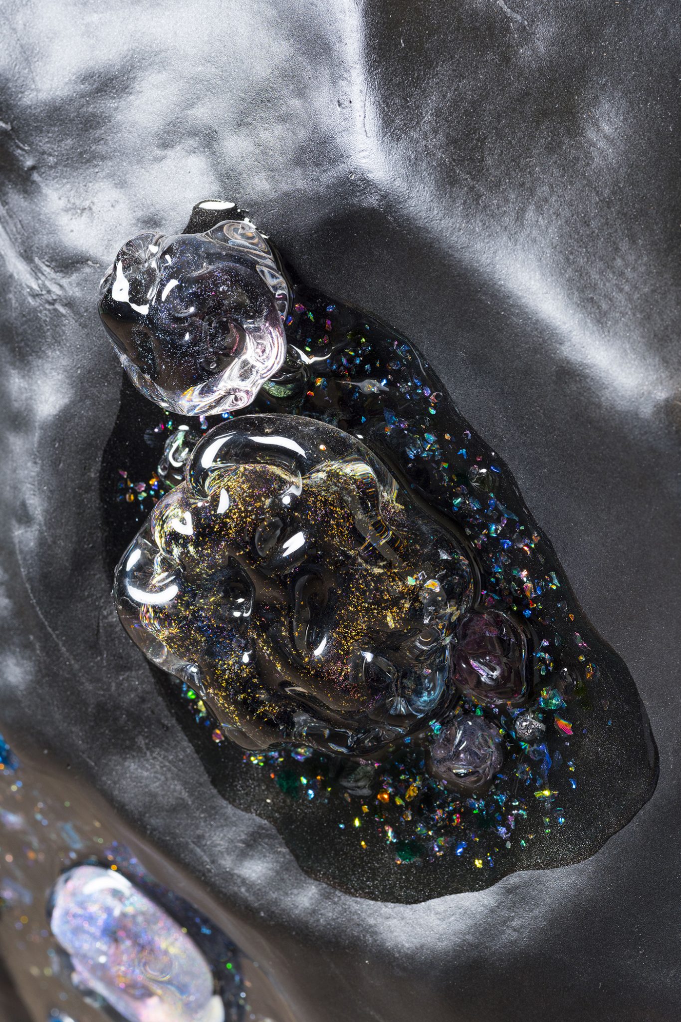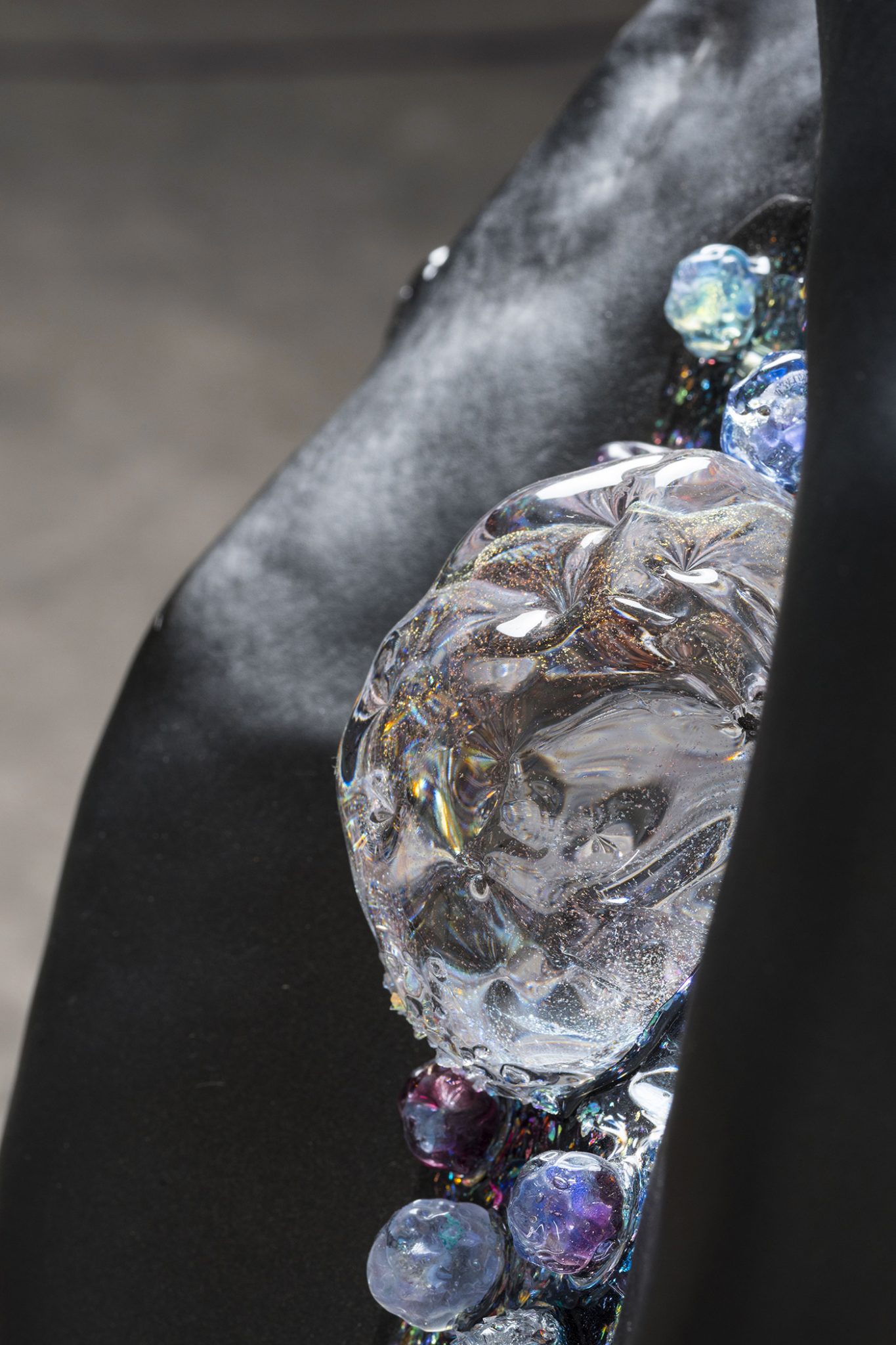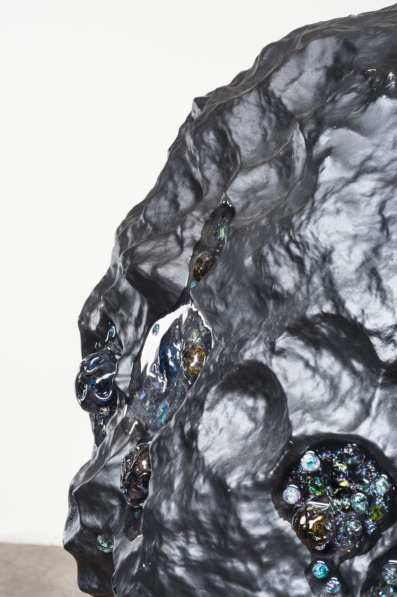 A large meteorite-like sculpture, Hyperterrestrial 1 features glass components suspended in an otherworldly magmatic stratum, creating an iridescent shimmer of lights. The geometry is generated through 3D modelling software, evoking artificial futuristic new forms of geology.