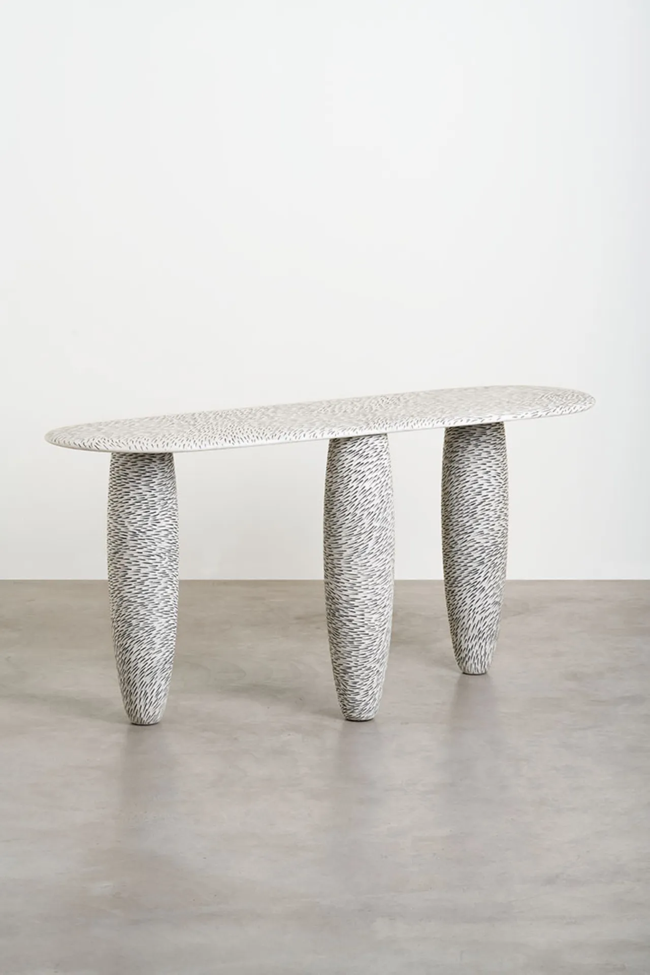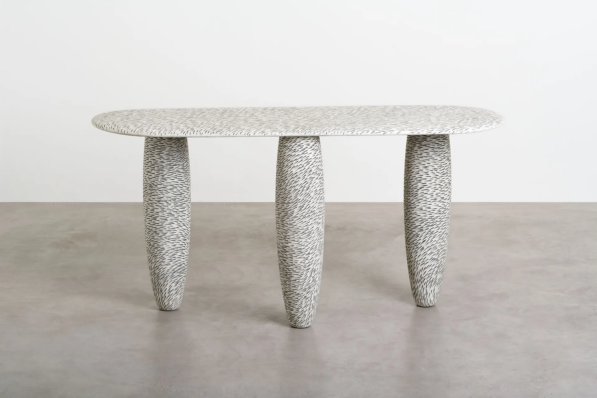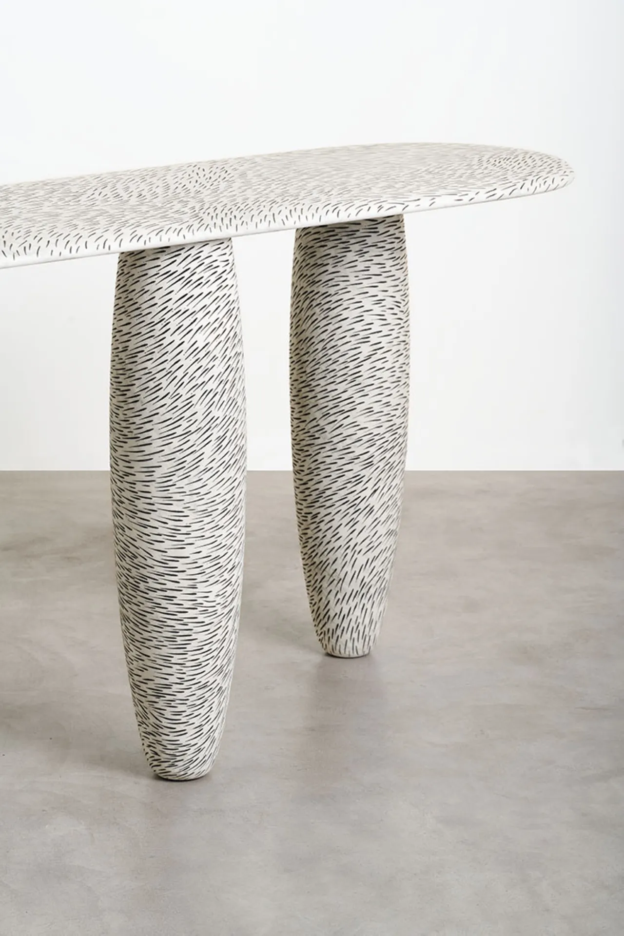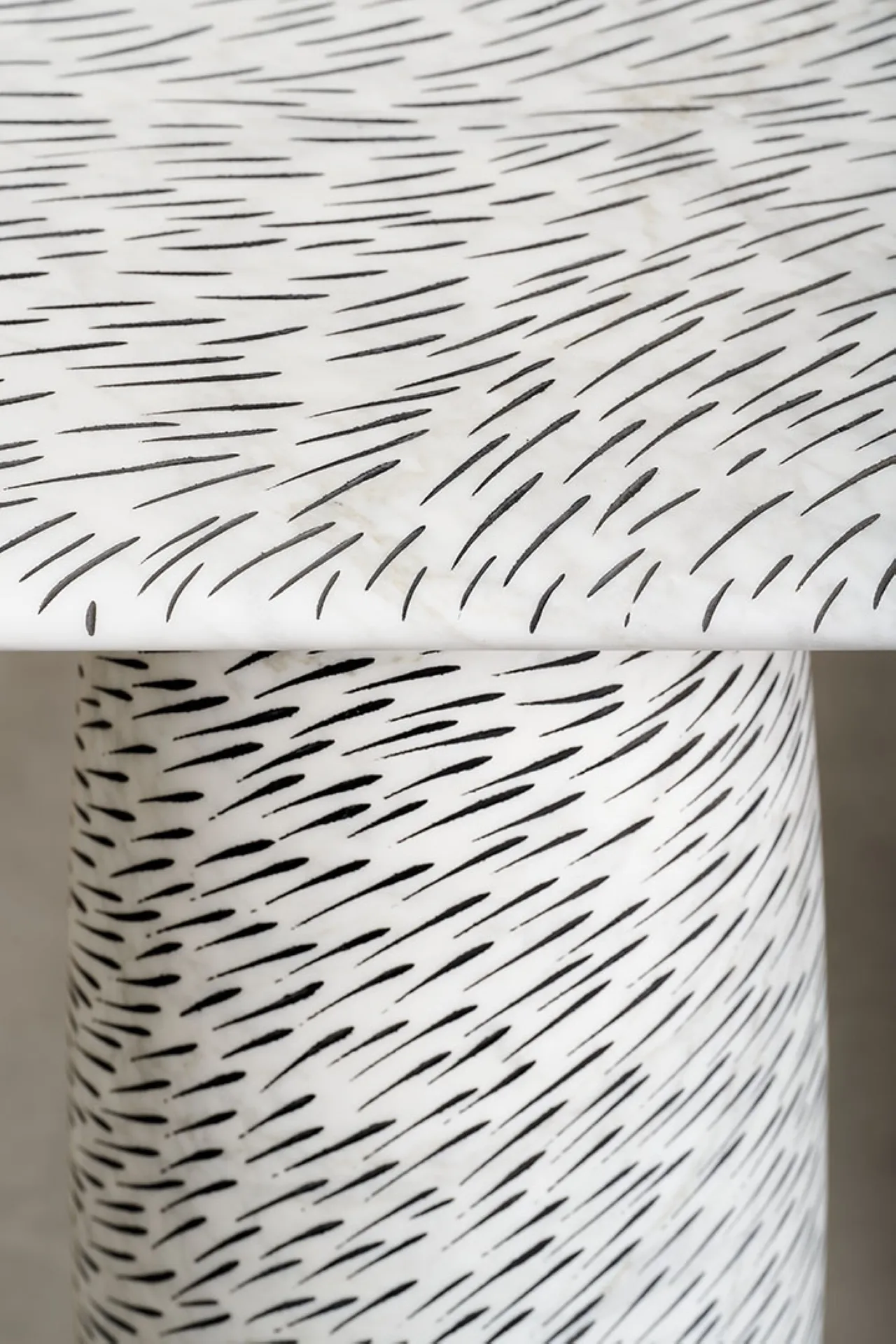 The Sgraffito marble tables collection explores the essence of primitive art. Drawing inspiration from the ancient practice of etching, Mancuso has methodically and meticulously carved thousands of marks into the soft organic curves of solid marble, exploring the movement and dimensions of this noble material. Thousands of small etches, filled with black paint, form a fur-like pattern, imbuing the surfaces with a lasting trace and dynamic sense of movement and energy.