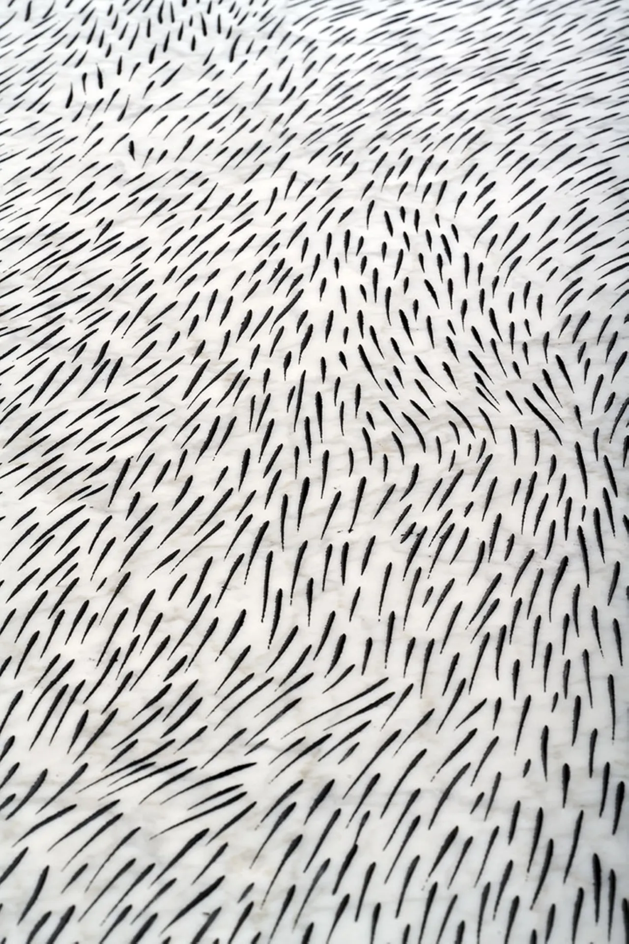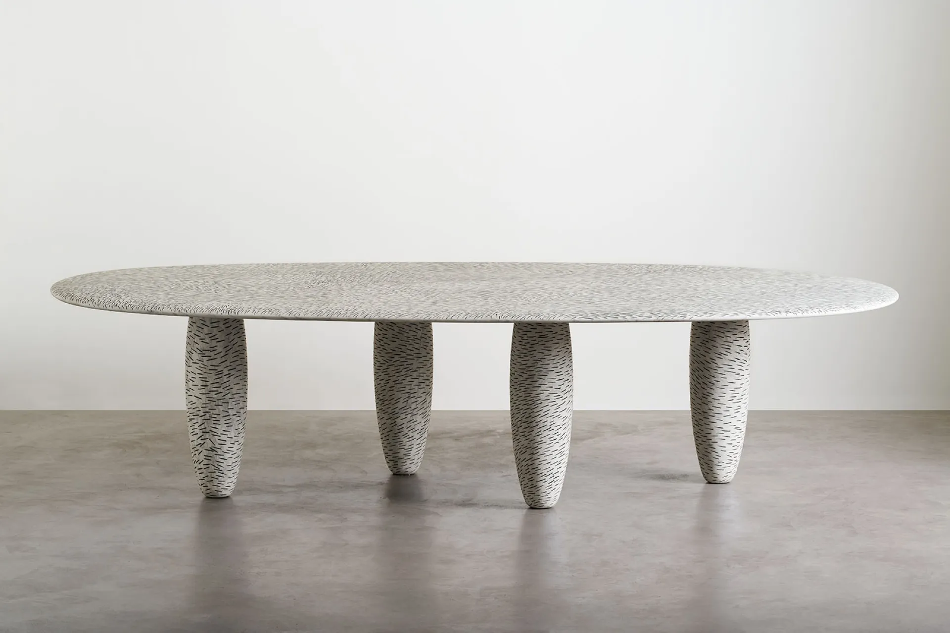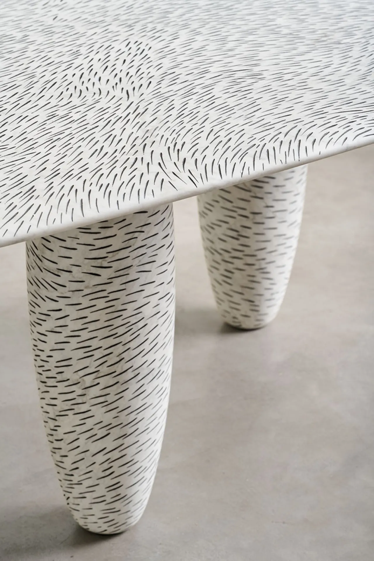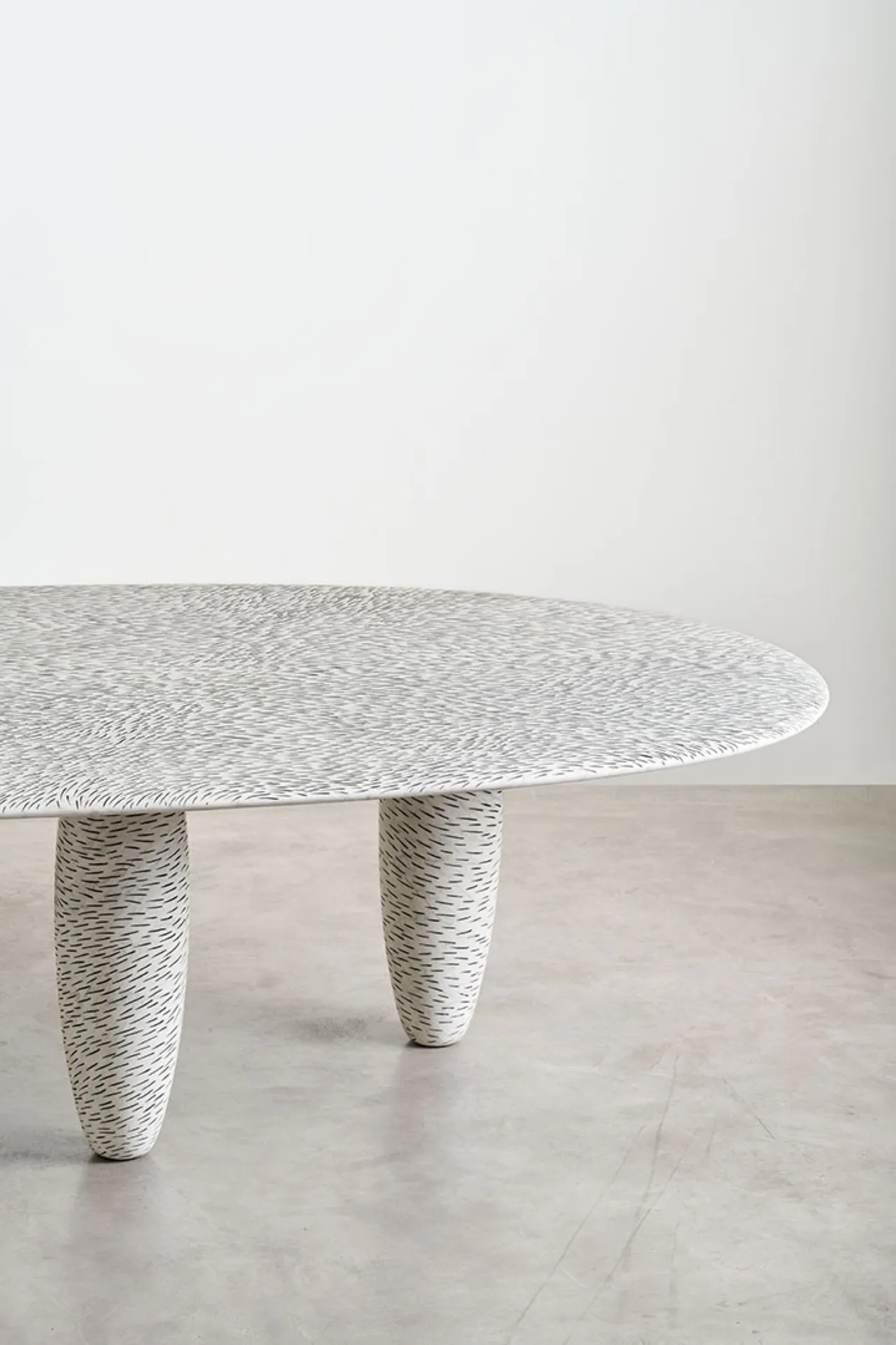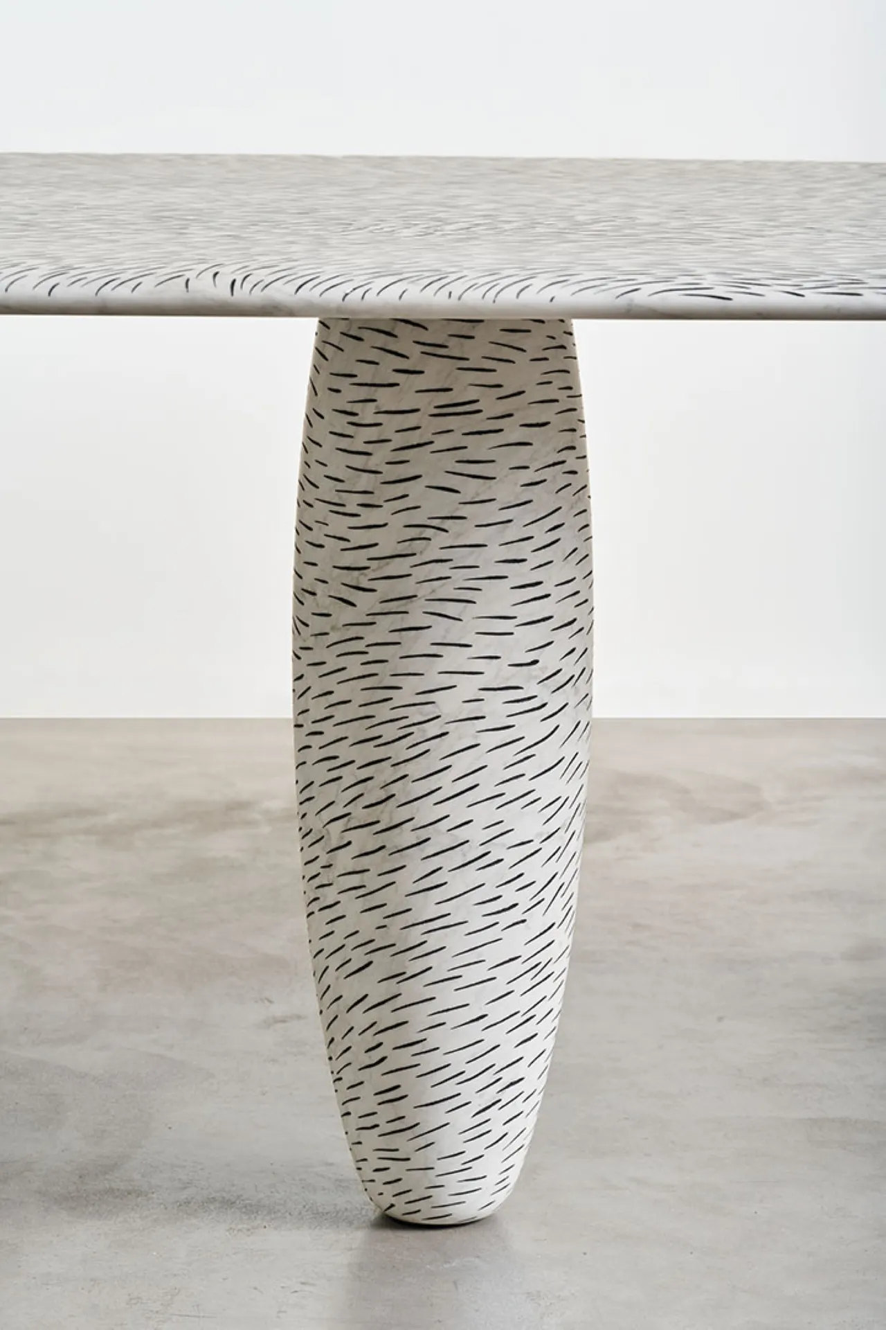 The Sgraffito marble tables collection explores the essence of primitive art. Drawing inspiration from the ancient practice of etching, Mancuso has methodically and meticulously carved thousands of marks into the soft organic curves of solid marble, exploring the movement and dimensions of this noble material. Thousands of small etches, filled with black paint, form a fur-like pattern, imbuing the surfaces with a lasting trace and dynamic sense of movement and energy.