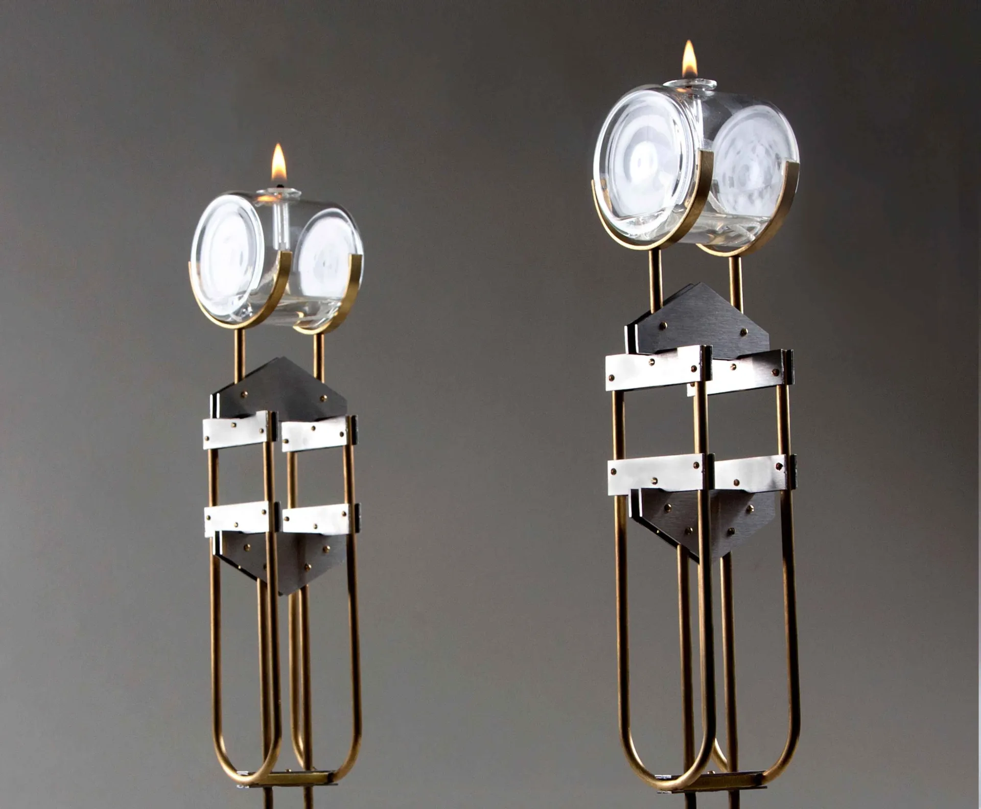 Brass, brushed stainless steel, Pyrex glass