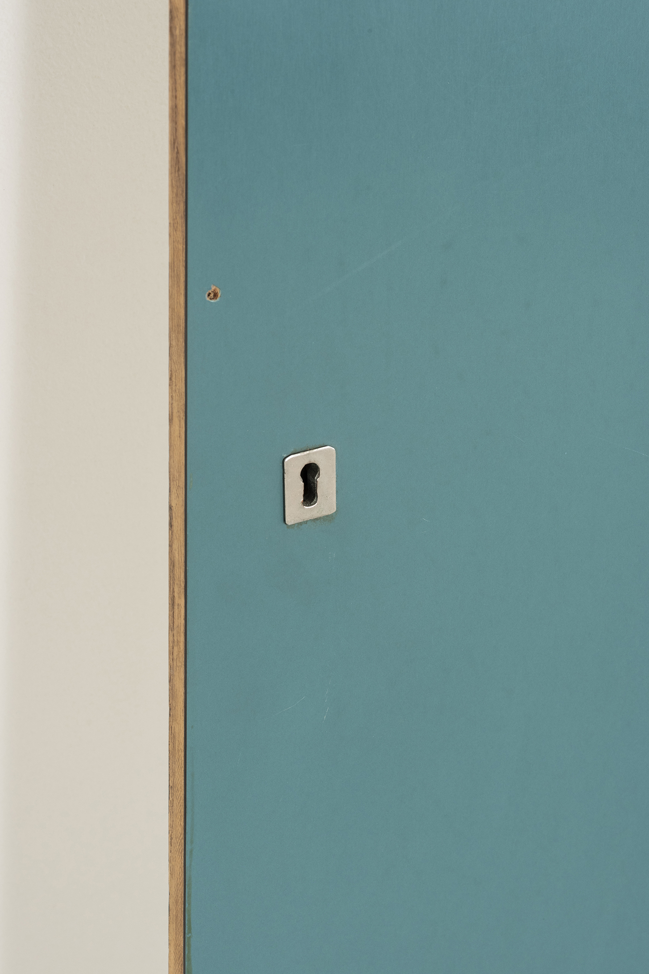 Created for Hotel Parco dei Principi of Sorrento in the 1960s, this closet door exemplifies the last period of Gio Ponti’s career. Featuring only wood and light-blue, and a simple yet captivating shape, this piece stands as a timeless icon. A multidisciplinary talent, Gio Ponti investigated art, architecture and design through continuous research into shapes, materials and the essence of reality. Ponti believed that design transcended mere functionality, seeking to harmonize form, creativity, beauty and efficiency.