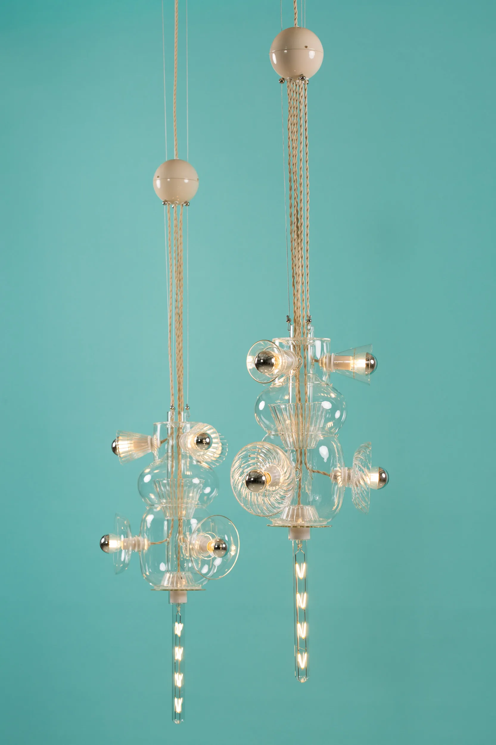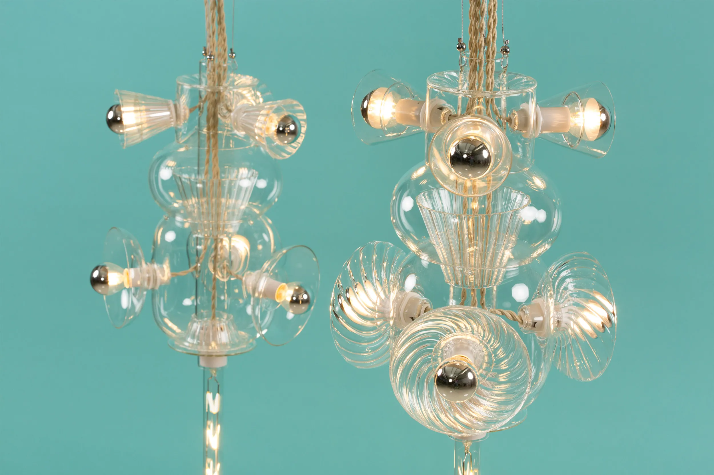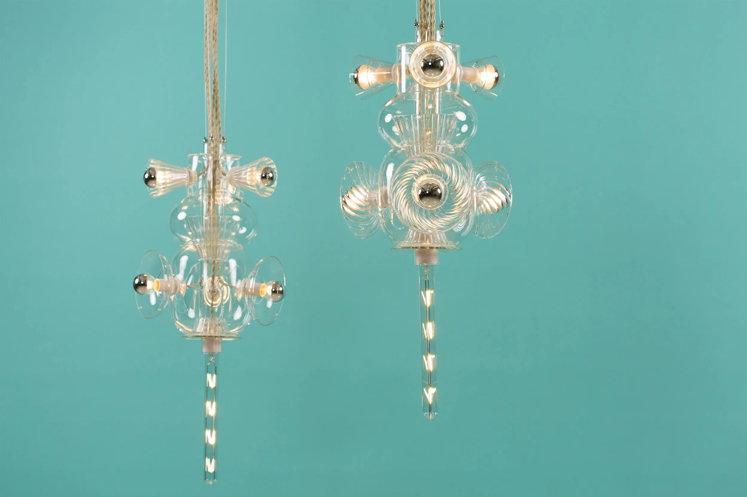 Developed out of Bethan’s fascination with the interplay of shapes, colors, and textures, Totem explores the unique properties of Pyrex glass through the artistry of hand-blown techniques. The layered volumes interlock to create an airy light. The collection celebrates the translucency and thinness intrinsic to this type of glass, usually associated with the medical and chemistry industries.