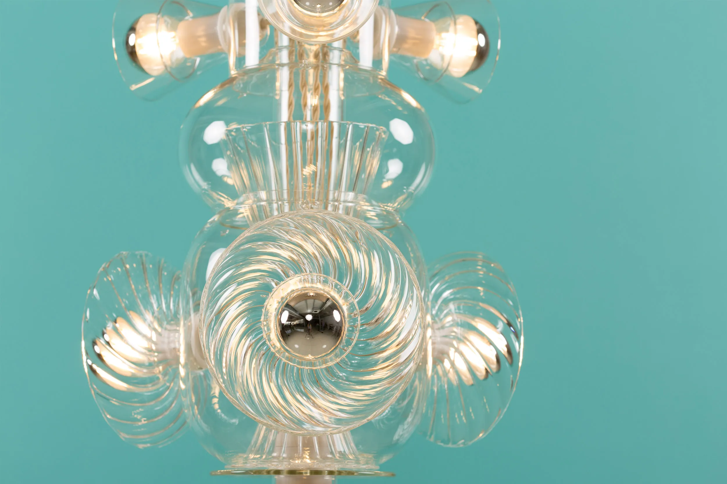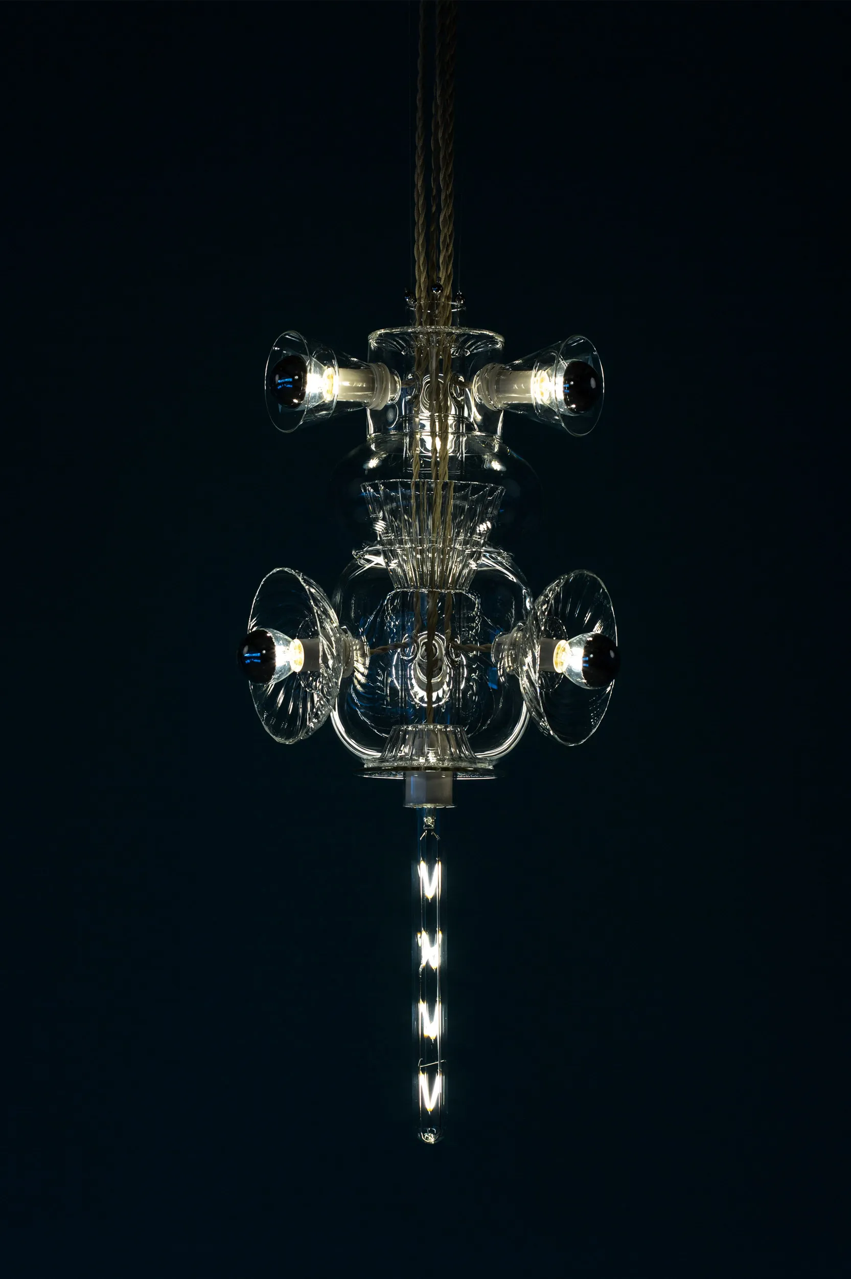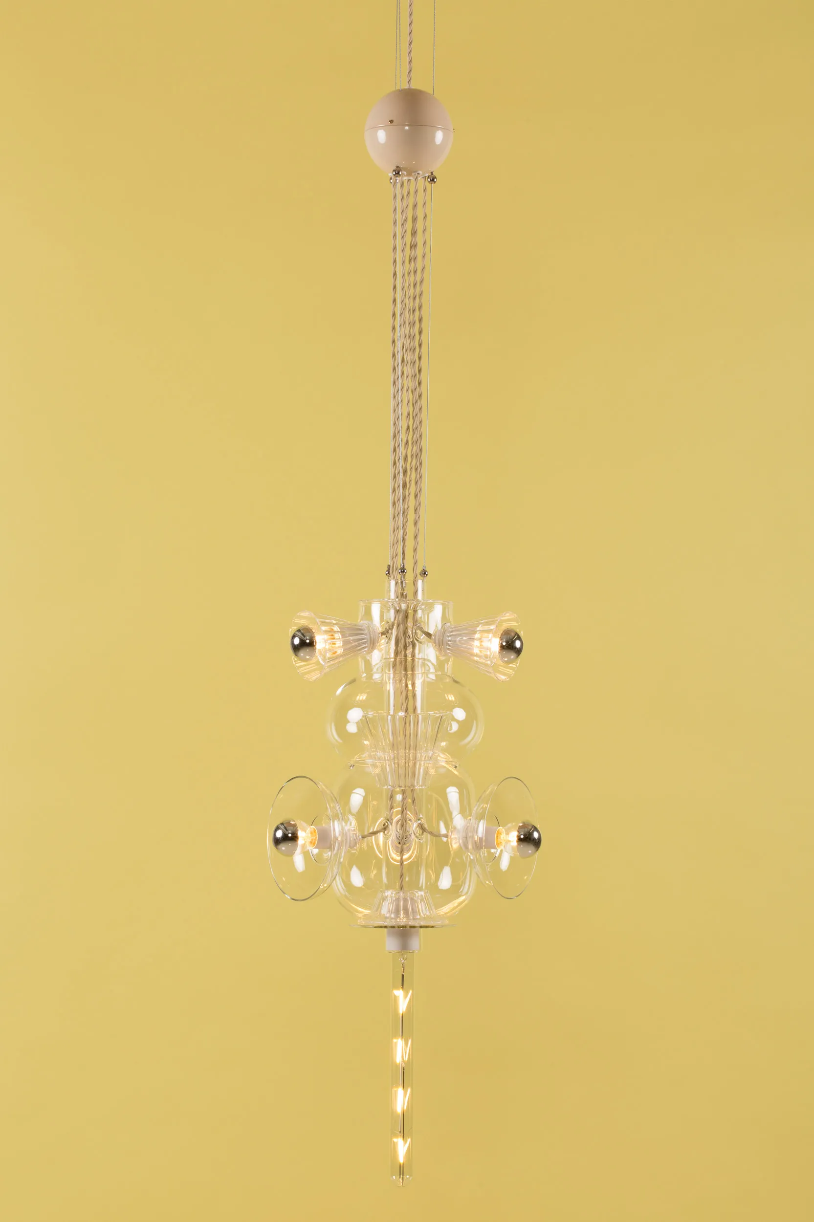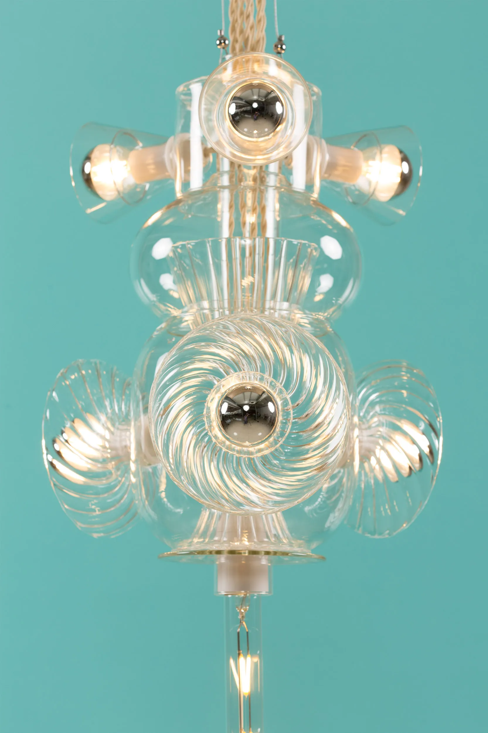 Developed out of Bethan’s fascination with the interplay of shapes, colors, and textures, Totem explores the unique properties of Pyrex glass through the artistry of hand-blown techniques. The layered volumes interlock to create an airy light. The collection celebrates the translucency and thinness intrinsic to this type of glass, usually associated with the medical and chemistry industries.