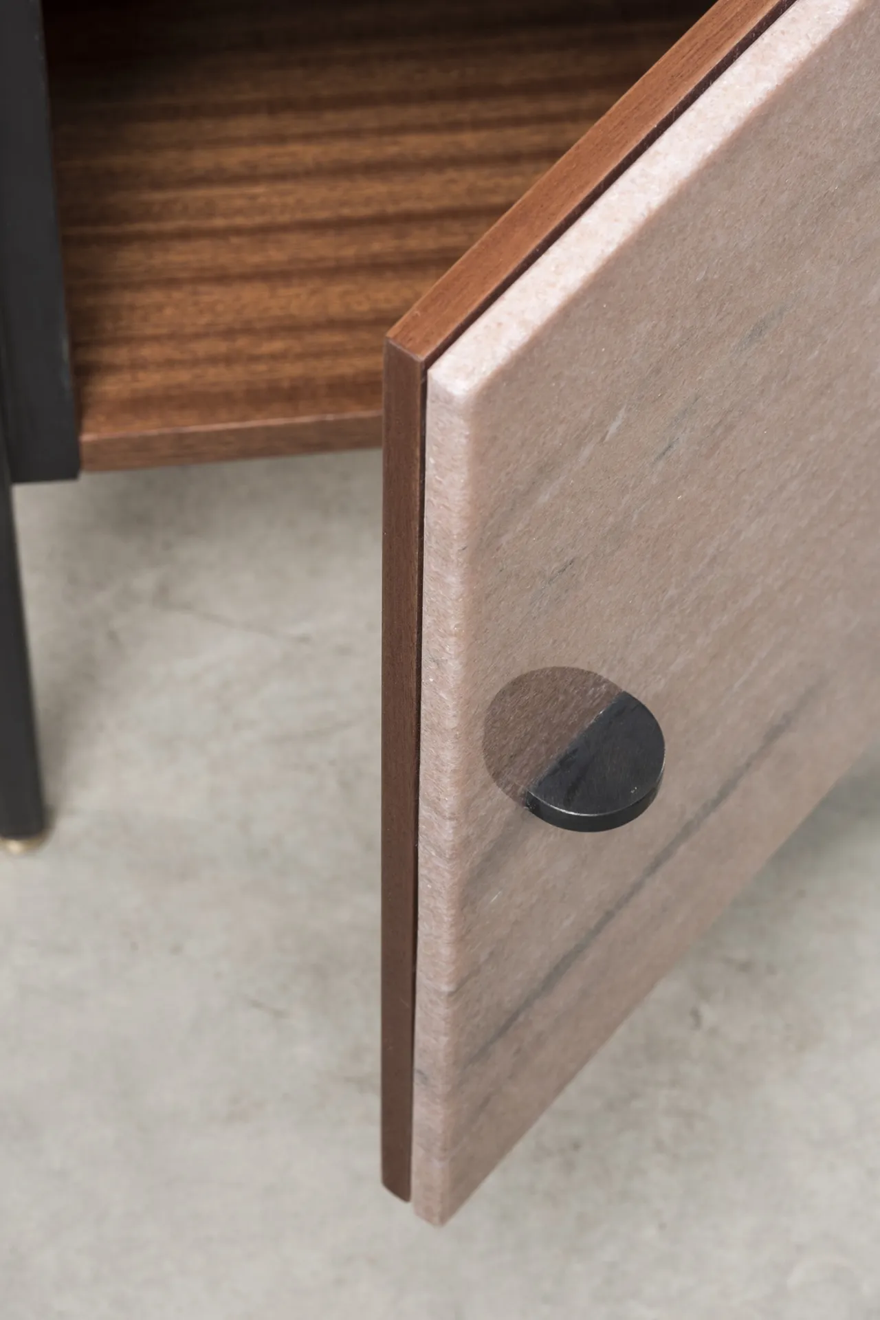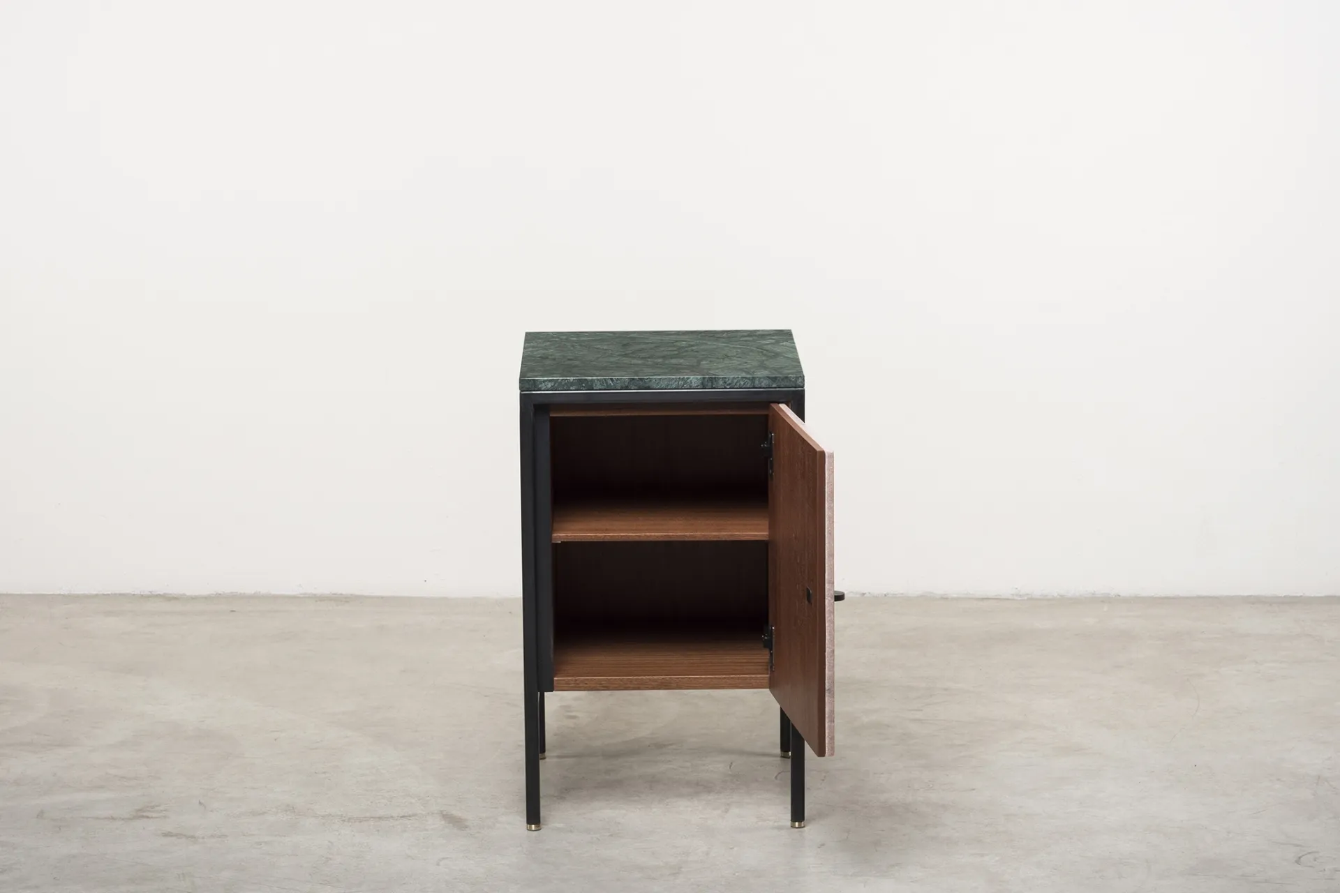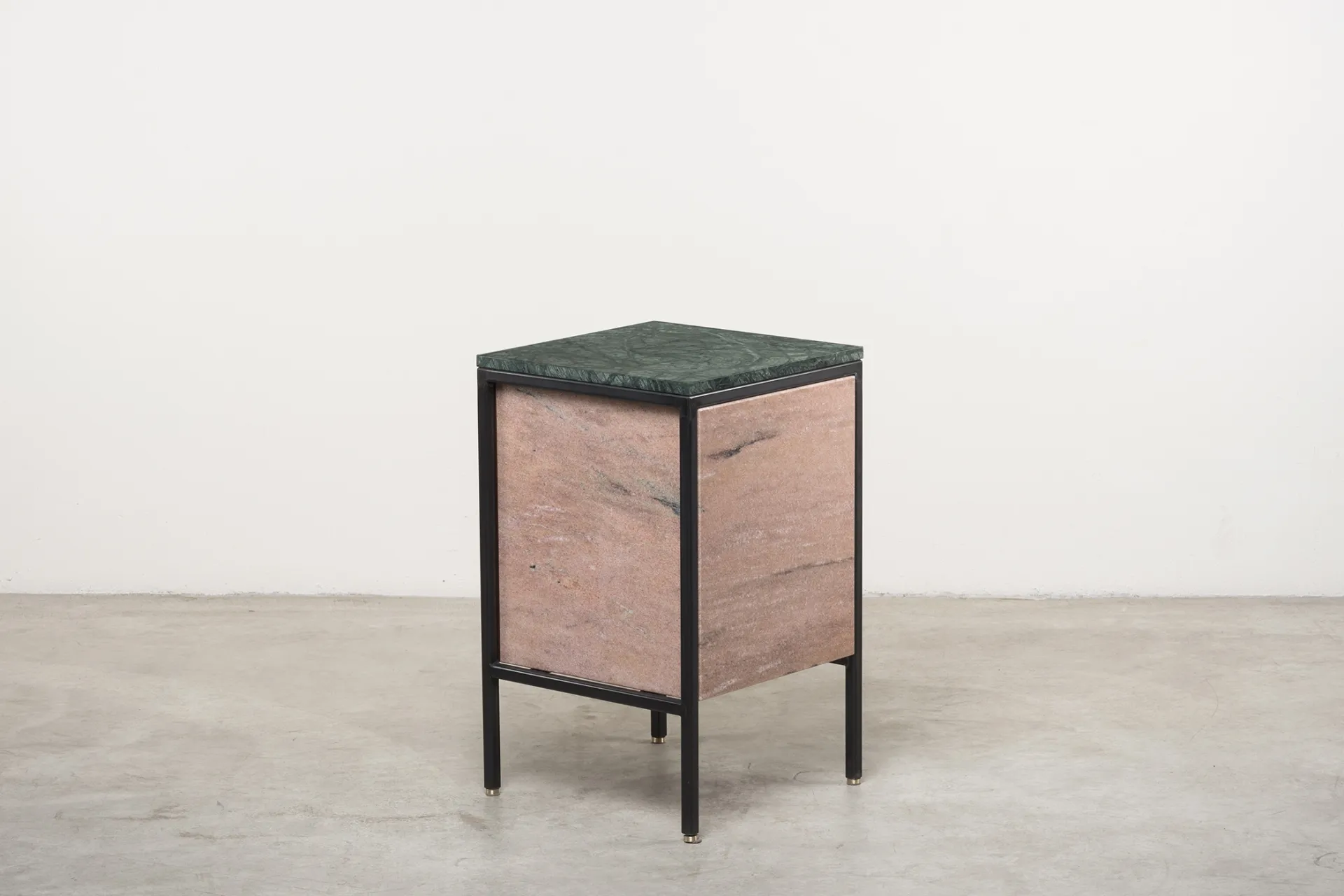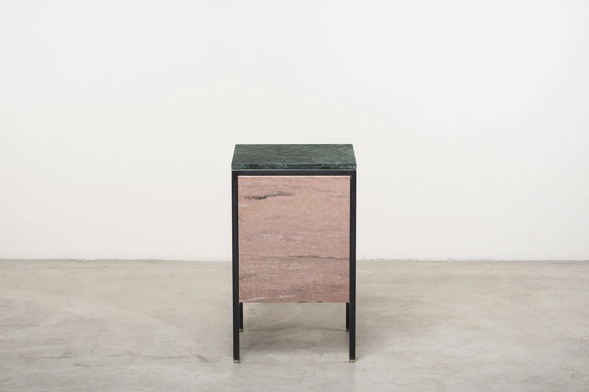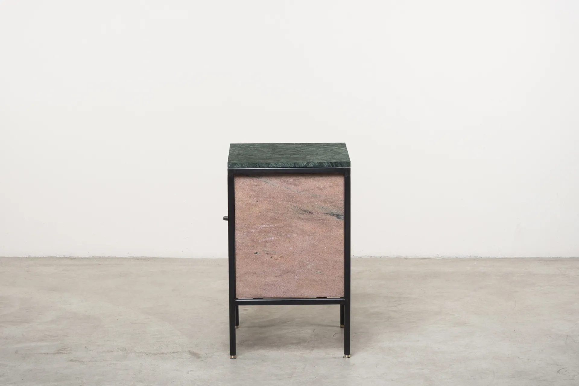 Black iron structure, Verde Guatemala marble top, Rosa Portogallo marble door