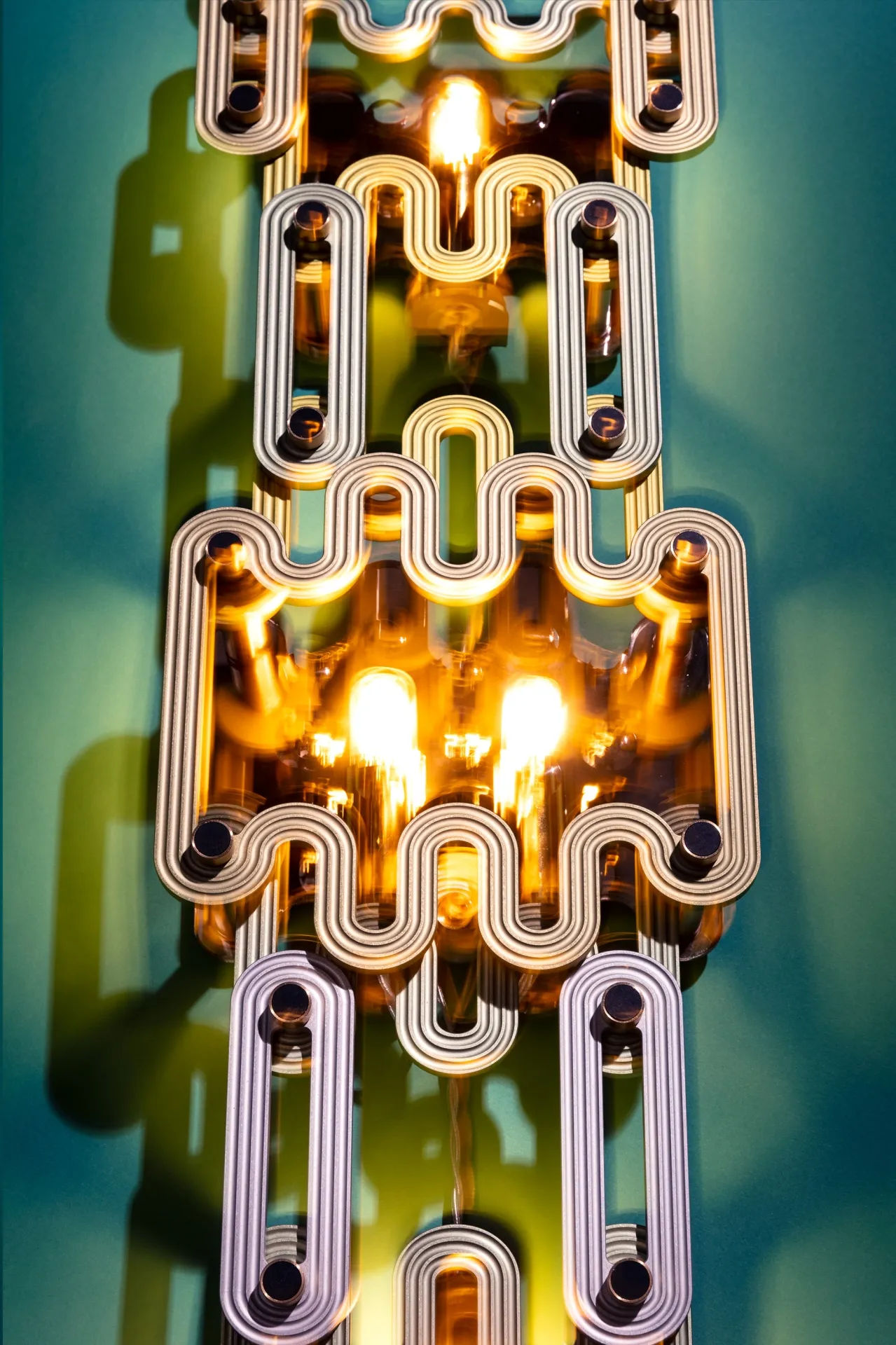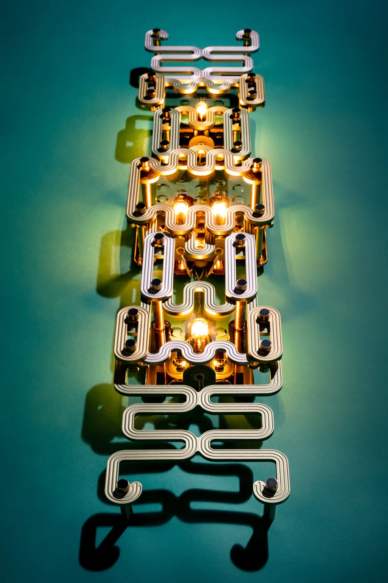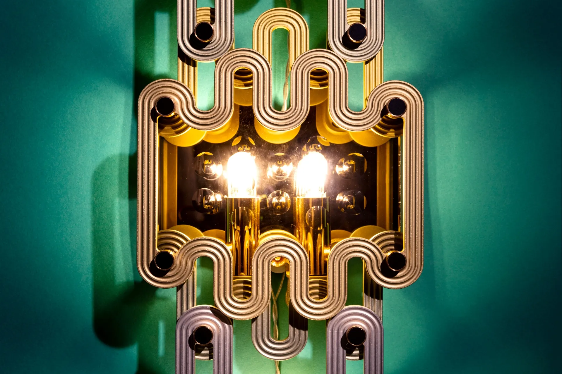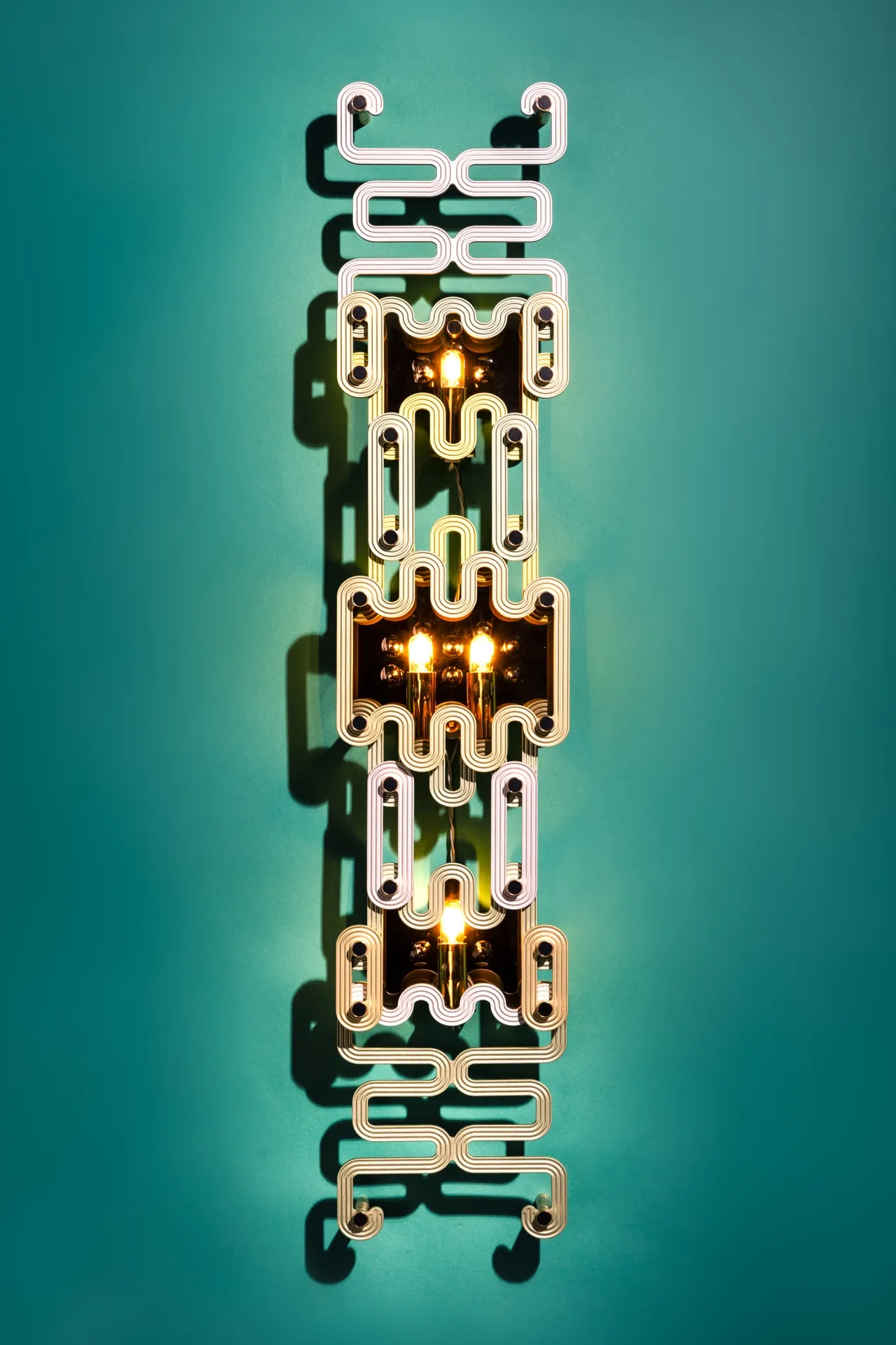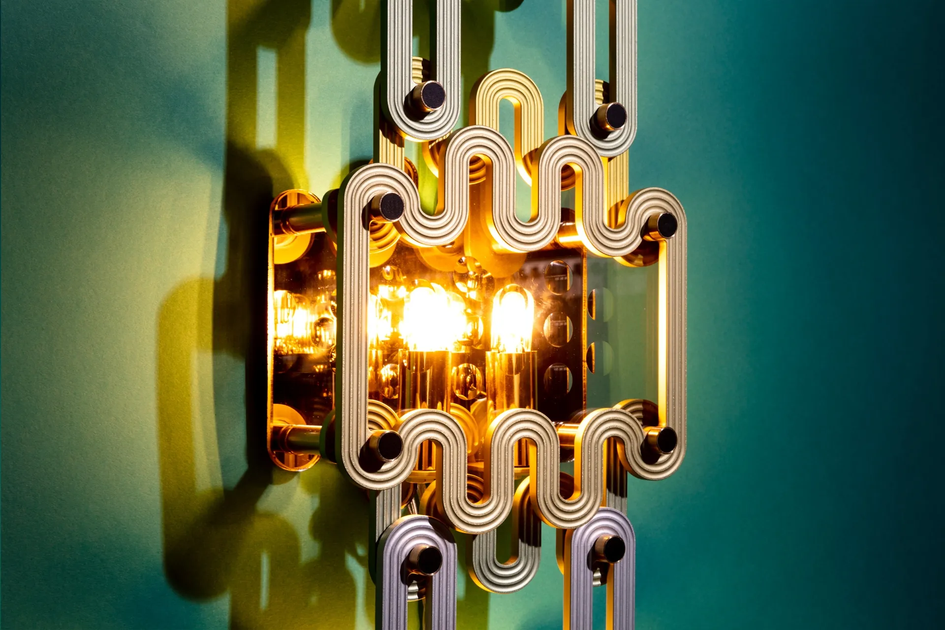 A series of wiggle and curve modules interlock to create a variety of structures. The first pieces of the new collection are a decorative bedhead and pair of scones, inspired by a mix of Peggy Guggenheim’s bedhead by Alexander Calder, and James McNeill Whistler’s “Harmony in Blue and Gold: The Peacock Room”.