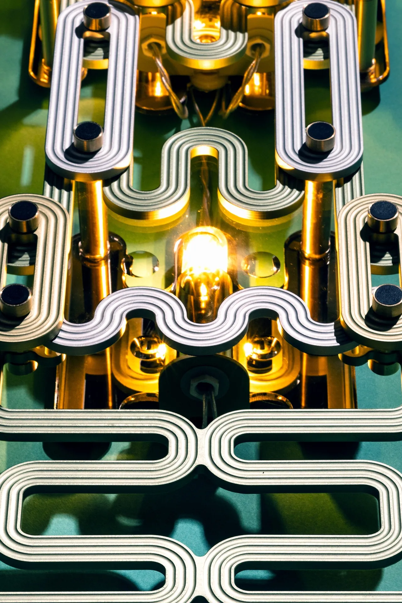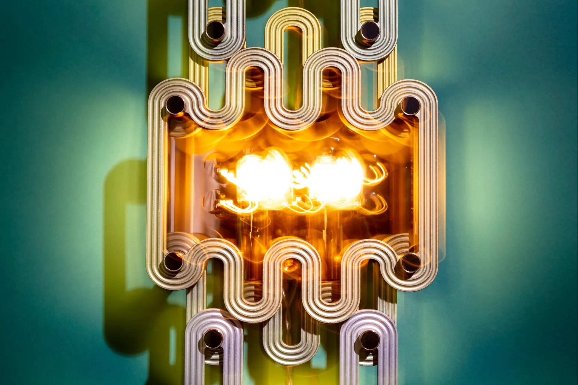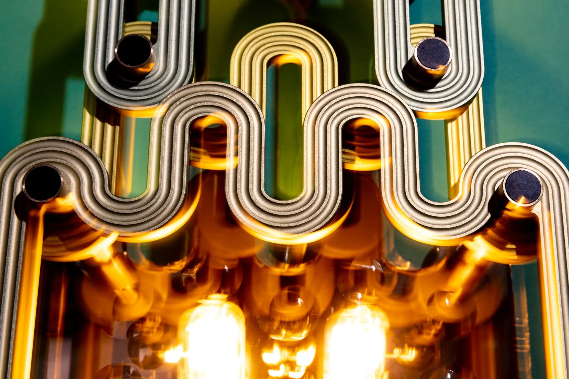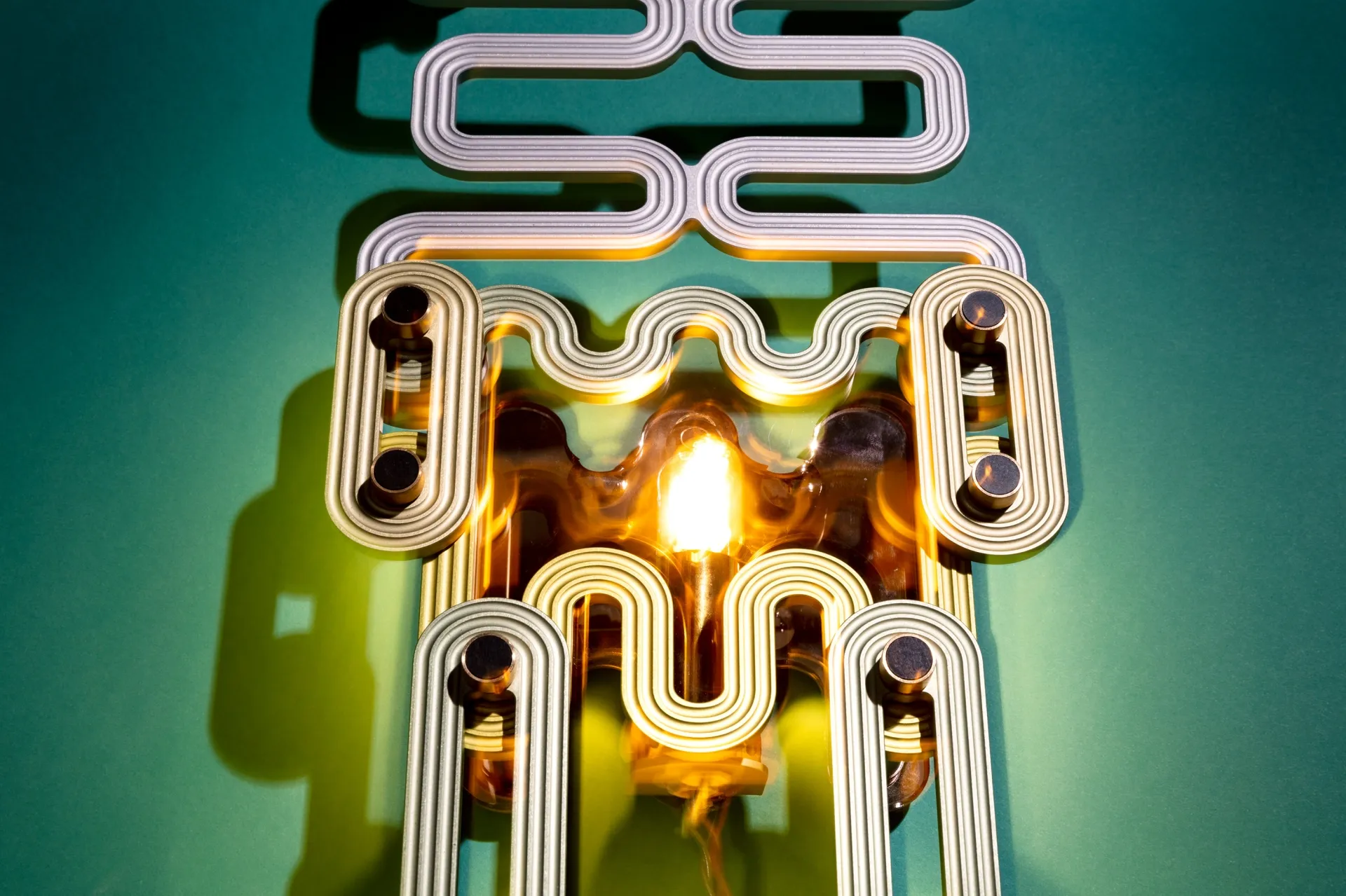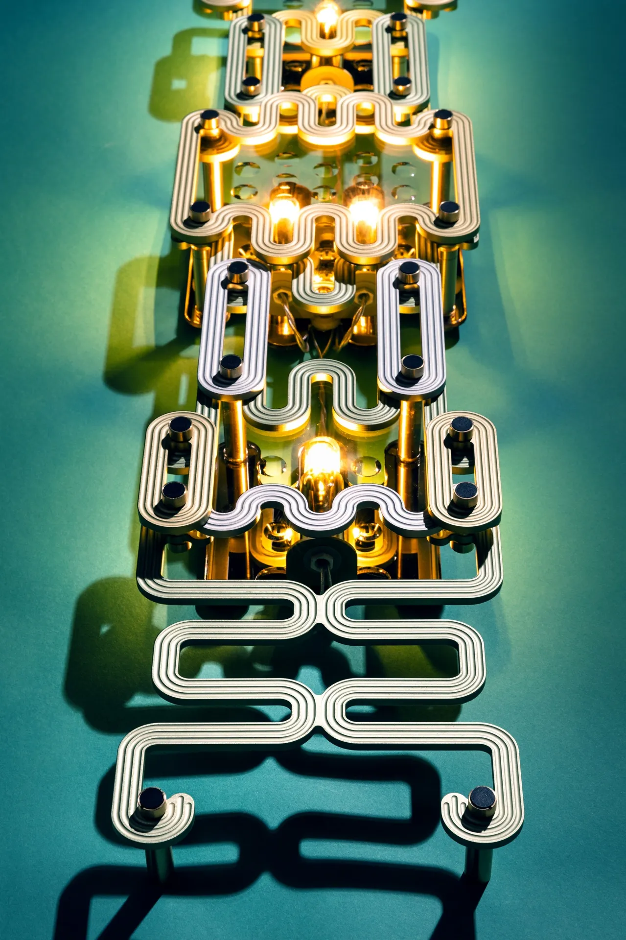 A series of wiggle and curve modules interlock to create a variety of structures. The first pieces of the new collection are a decorative bedhead and pair of scones, inspired by a mix of Peggy Guggenheim’s bedhead by Alexander Calder, and James McNeill Whistler’s “Harmony in Blue and Gold: The Peacock Room”.