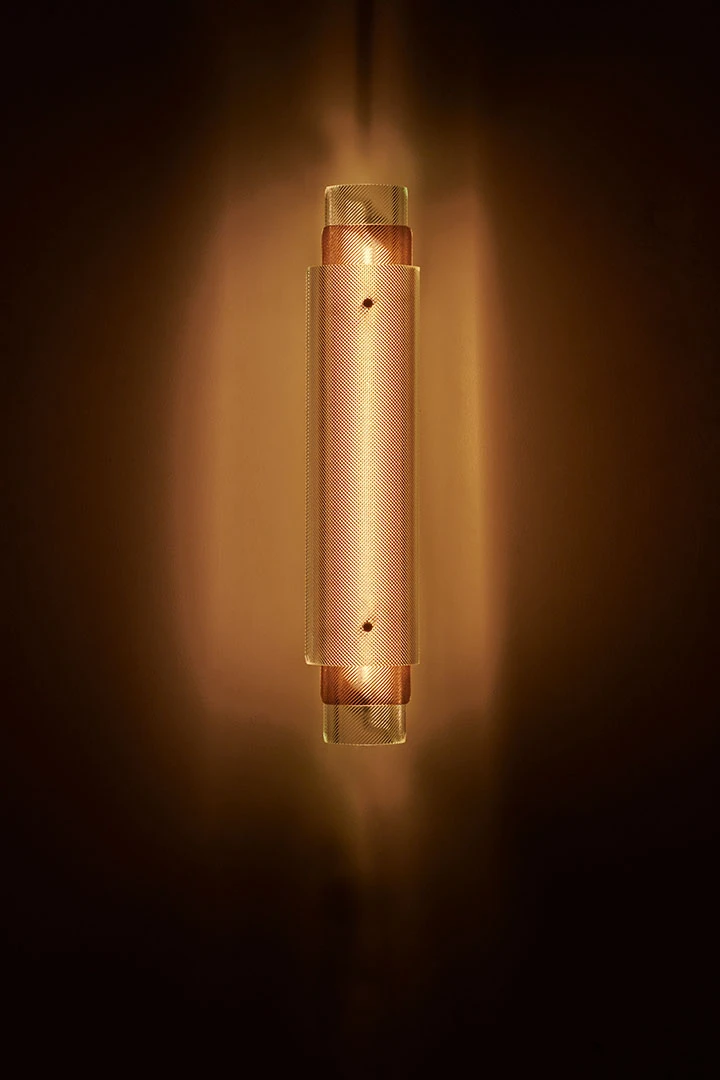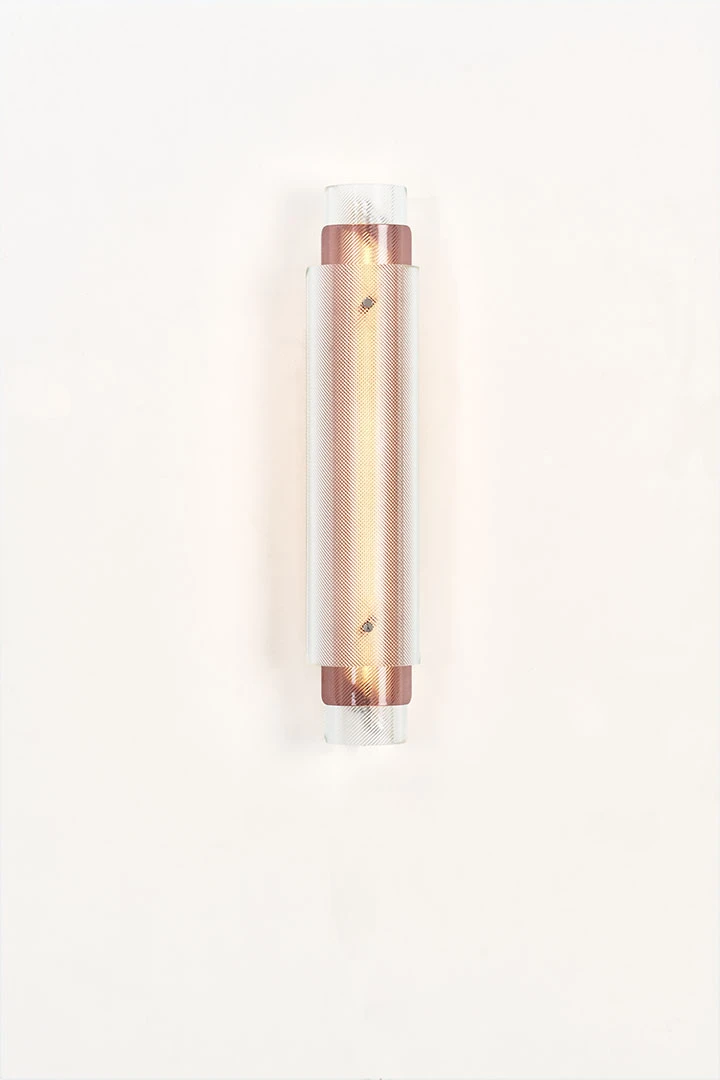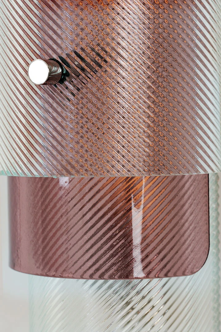 Industrial glass is transformed into a stunning decorative element in the Spindle lamp series as cylindrical shapes of fluted glass are superimposed in opposite directions to create a hypnotic optical illusion emphasized by the inclusion of colored glass. The curved glass is realized by an expert artisan and sits inside a stainless steel structure.