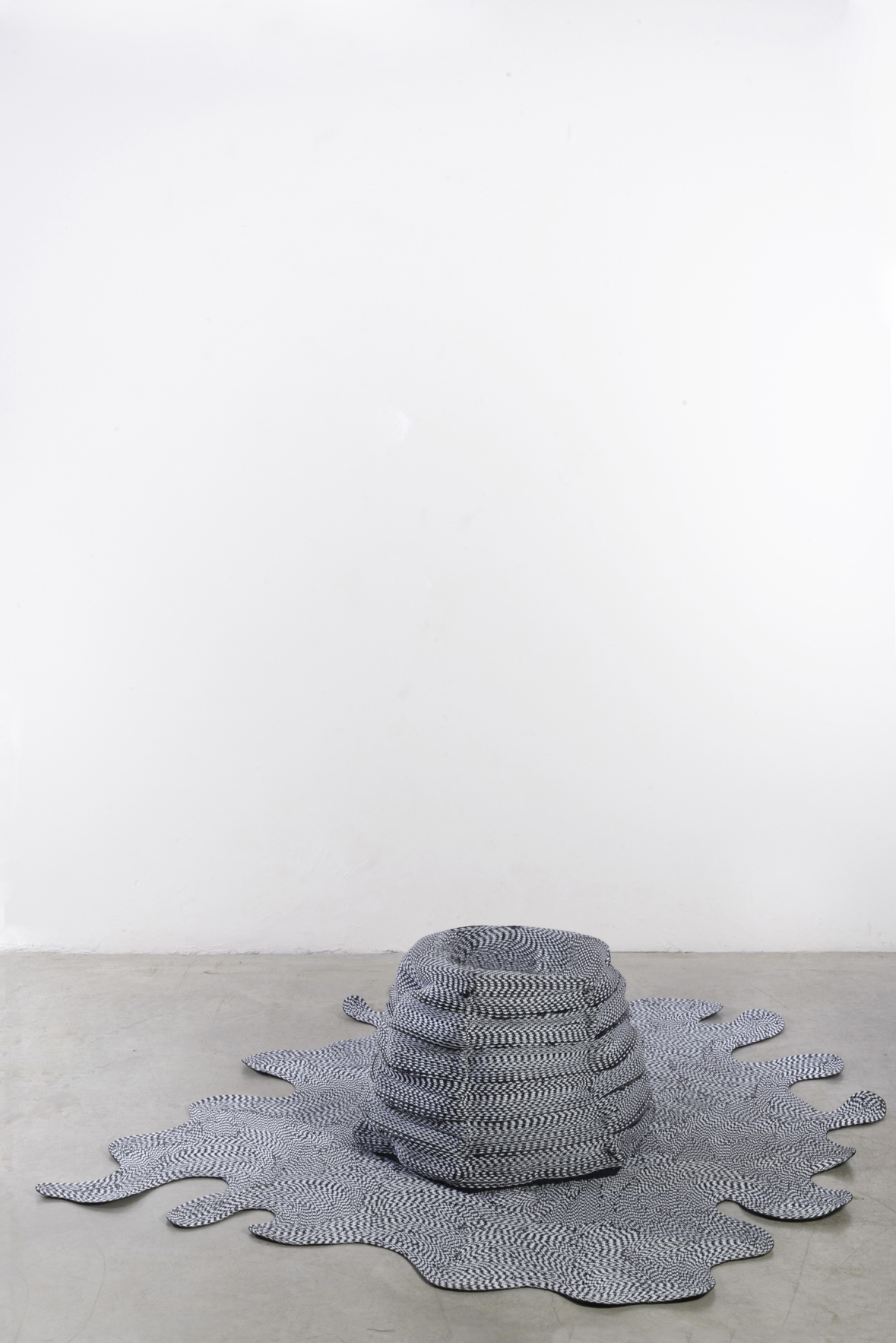 The Wobbly Carpet and Soft Stool by Wendy Andreu, part of the Regen Camouflage collection, transforms silicone and cotton into a dynamic and captivating piece. Crafted around a rotating steel mold, its distinctive form is filled with polystyrene, creating a soft, sculptural piece. Each piece of the collection is unique, blending art and functionality.