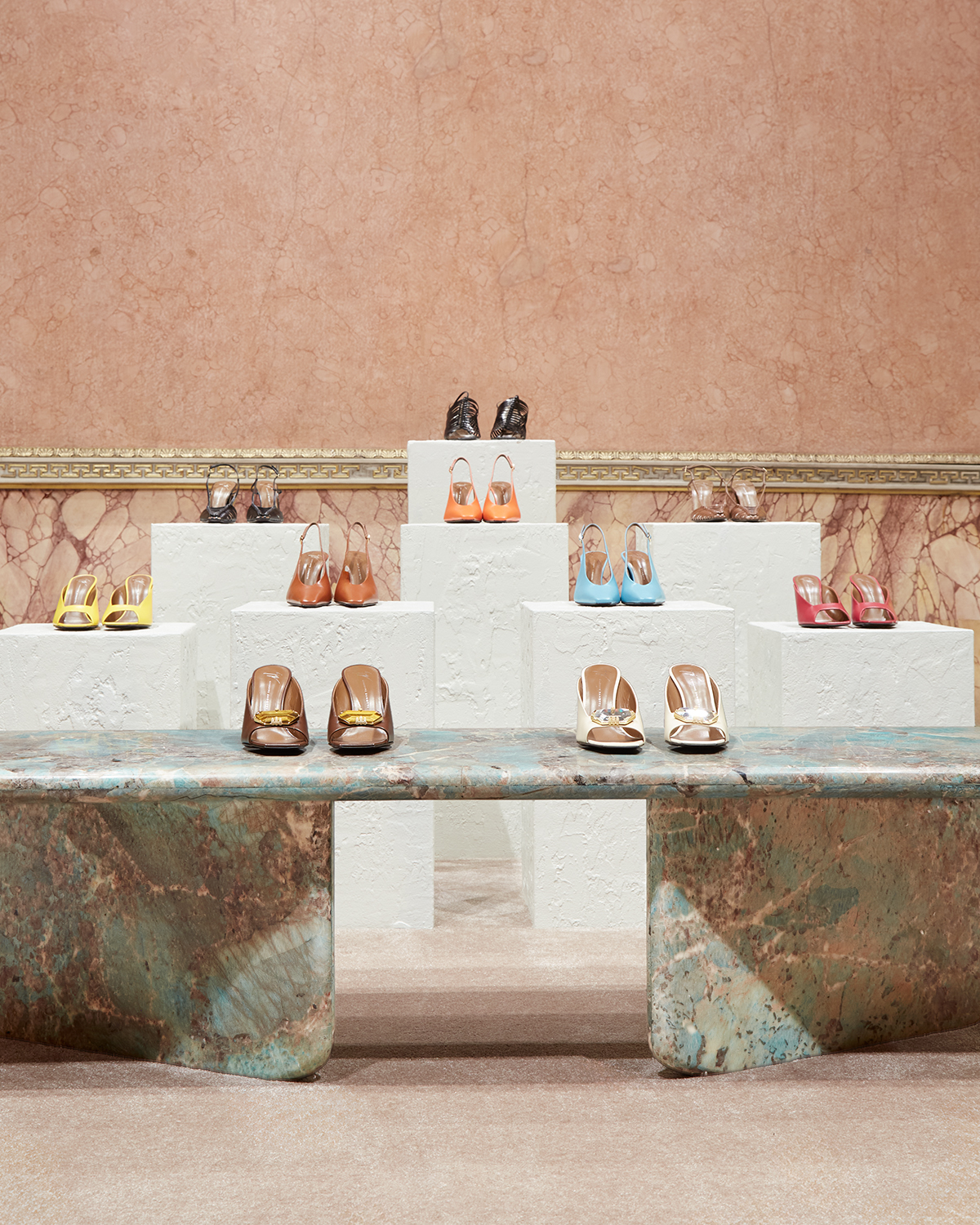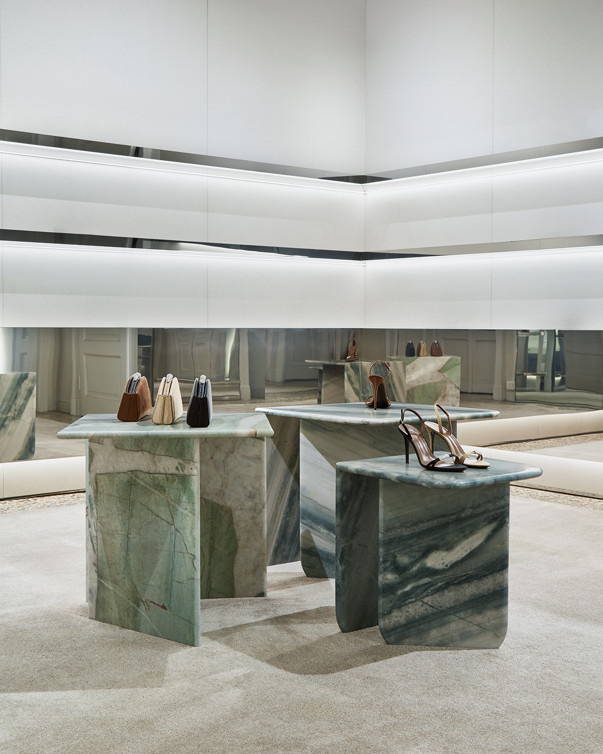 Green marble with intense veining, satin-finish aluminum, and green stone are arranged in a sophisticated play of contrasts, where tables, armchairs, and seating coexist in perfect harmony. Every choice of color and material is in close dialogue with the architecture and original finishes of the space, creating a seamless interaction between interior and installation. The result is an elegant, experimental narrative that celebrates the synergy between design and the aesthetic universe of the Zanotti.